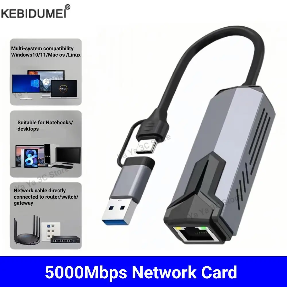 Comprar Tarjeta de red con cable de 5000Mbps, adaptador USB 3,0 tipo C a Ethernet RJ45, convertidor Gigabit Lan RJ45 de 100/1000/5000Mbps para PC y portátil