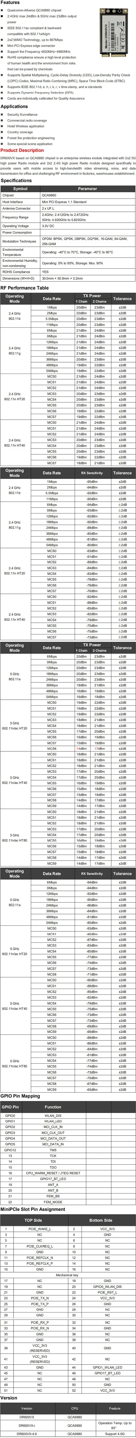 Tarjeta de red DR600VX Qualcomm Atheros QCA9880 módulo WiFi banda Dual 2,4 GHz 5GHz 2x2 MIMO IEEE 802.11ac/a/b/g/n Mini PCI Express