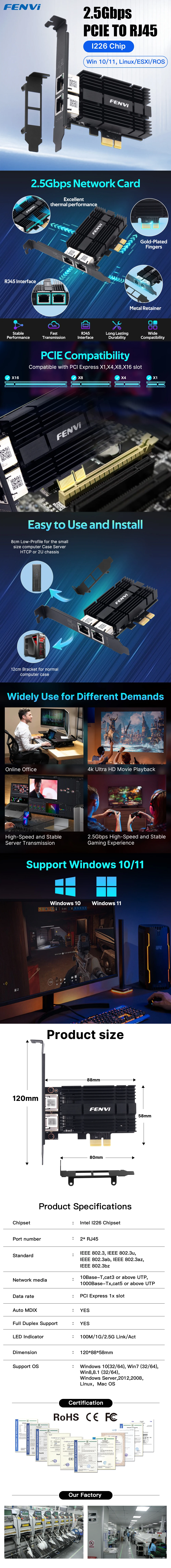 FENVI 2.5G PCIE a tarjeta de red RJ45 para chipset Intel I226 Gigabit Ethernet puertos duales adaptador de red 100/1000/2500Mbps para PC