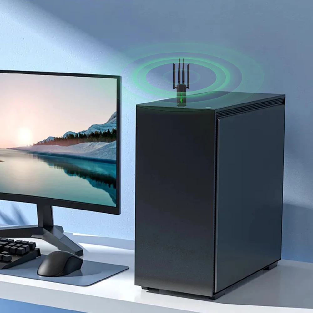 2. Libertad de WiFi del escritorio:¿Estás cansado de que los cables largos de tu PC de escritorio arruinen la decoración de tu hogar?Con un dongle de recepción de señal de 1300M, su escritorio puede disfrutar de la conectividad WiFi sin ensuciar.
