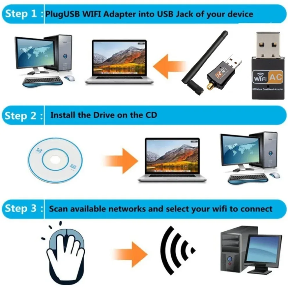 El adaptador LAN inalámbrico USB de doble banda con antena de 2dBi de largo alcance de alta ganancia le ofrece una pequeña manera de obtener conexiones Wi-Fi rápidas de próxima generación, conectándola al USB 2.0 interfaz de su PC, computadora portátil o Mac, puede establecer una conexión de 433 Mbps en una radio de 5 GHz o una conexión de 150 Mbps en 2.Radio de 4GHz con tu enrutador WiFi.Puede cambiar entre bandas WiFi de 2,4 GHz y 5 GHz para evitar interferencias y tener una conexión de Internet WiFi óptima para su PC, computadora portátil o Mac.
