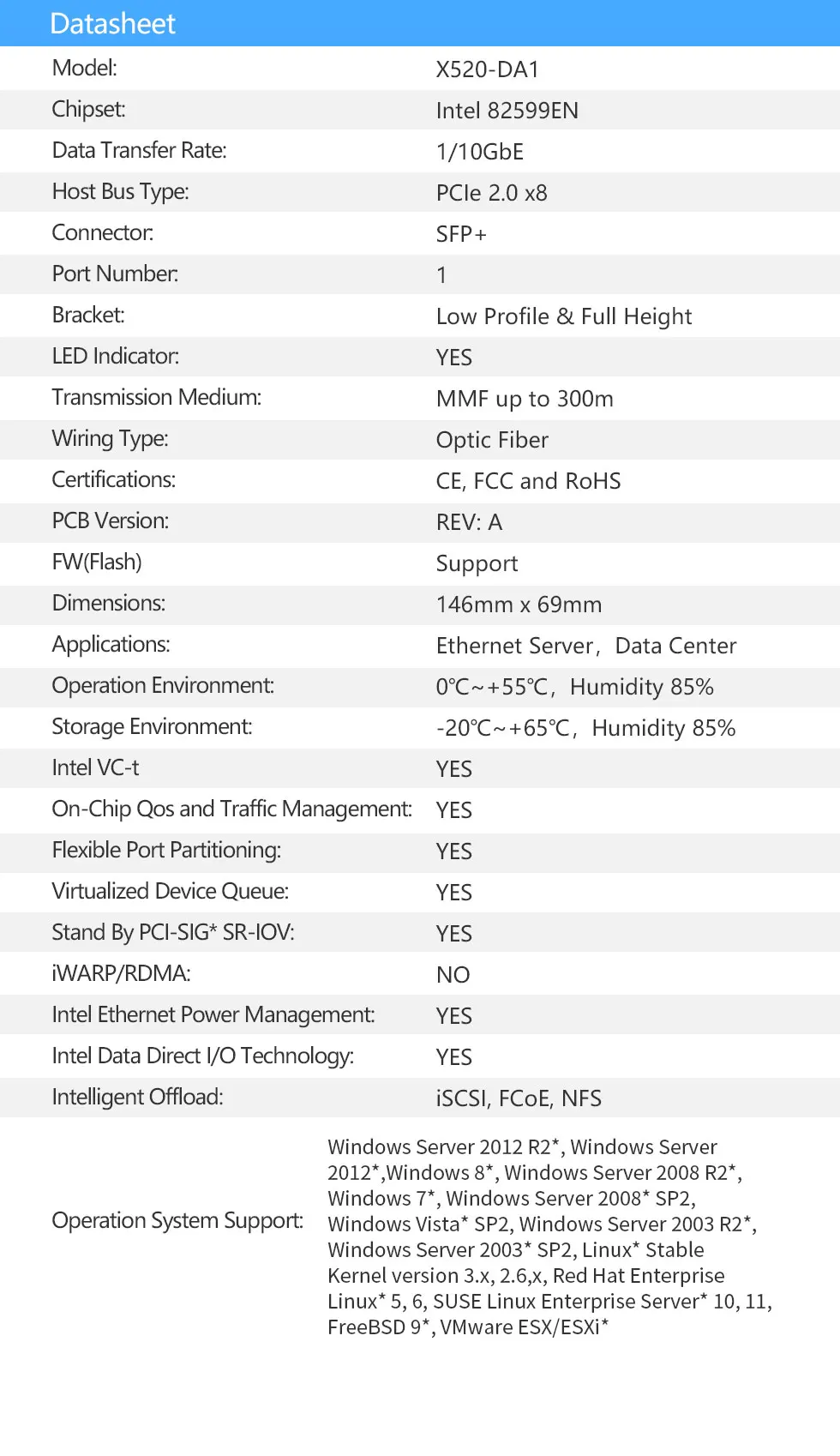 Alimentado por el controlador de red 10 GbE de tercera generación de Intel, el controlador Intel® Ethernet 82599 10 Gigabit Ethernet, el aborda las exigentes necesidades del centro de datos de próxima generación al proporcionar características inigualables para la virtualización, flexibilidad para redes LAN y SAN y rendimiento probado y confiable.