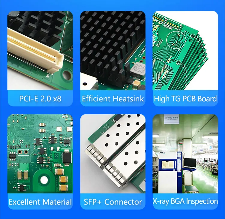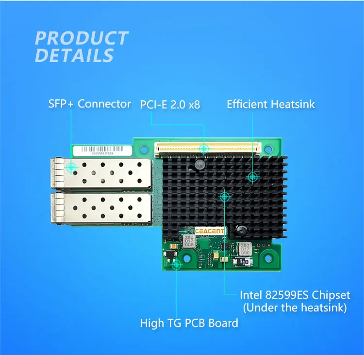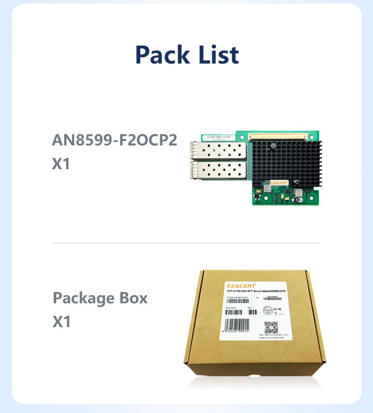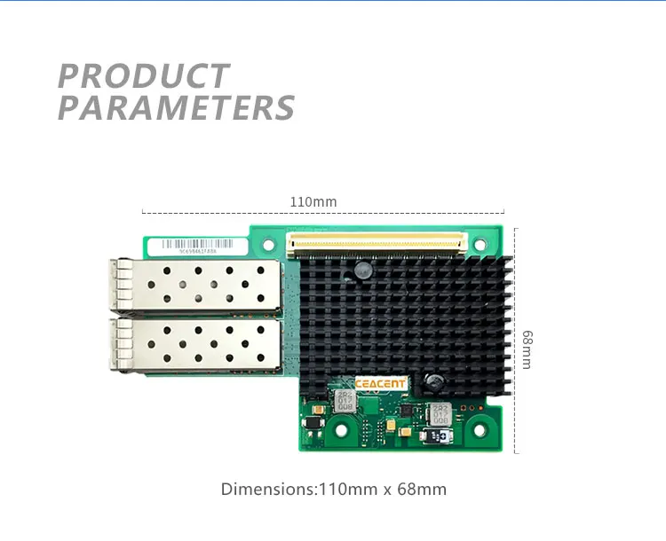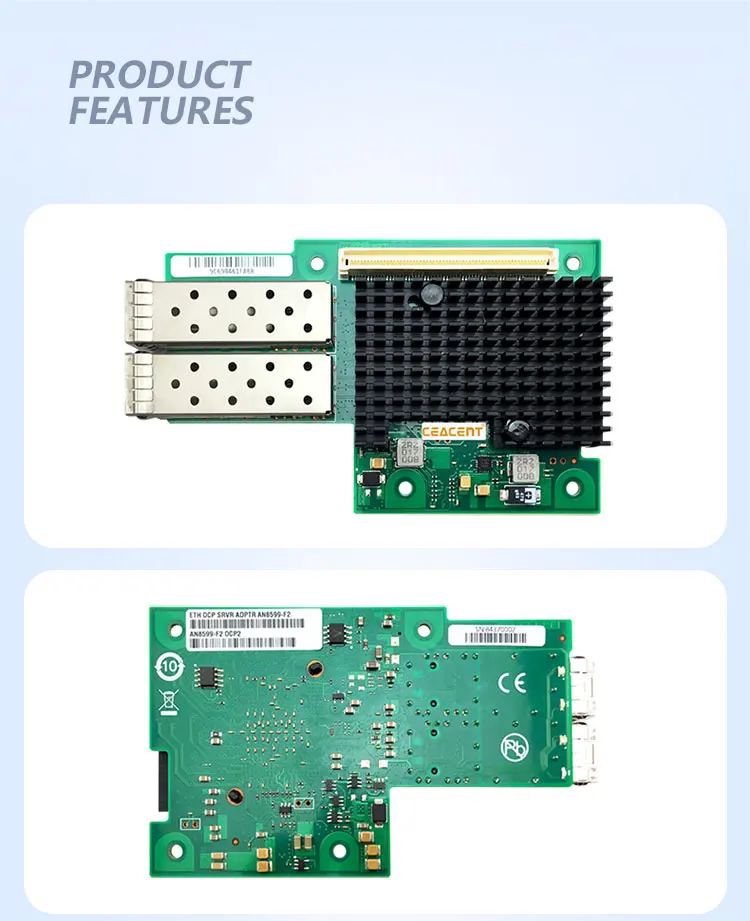 CEACENT 82599 es un adaptador de servidor de fibra de 10 Gigabit de doble puerto basado en Intel 2,0, desarrollado independientemente por Ceacent Electronics Ltd, con especificación de protocolo OCP. El diseño de esta tarjeta adaptadora de servidor tiene como objetivo optimizar los equipos de rack para servidores y proyectos de computación abierta (OCP) de alta gama, que pueden manejar mejor las aplicaciones intensivas basadas en datos. Al utilizar esta tarjeta adaptadora de servidor, es fácil diseñar y aplicar servidores y centros de datos más eficientes compartidos por industrias de TI ordinarias, que ayuda a promover el diseño y la práctica de servidores más eficientes y manejar cargas de trabajo específicas y desafiantes.