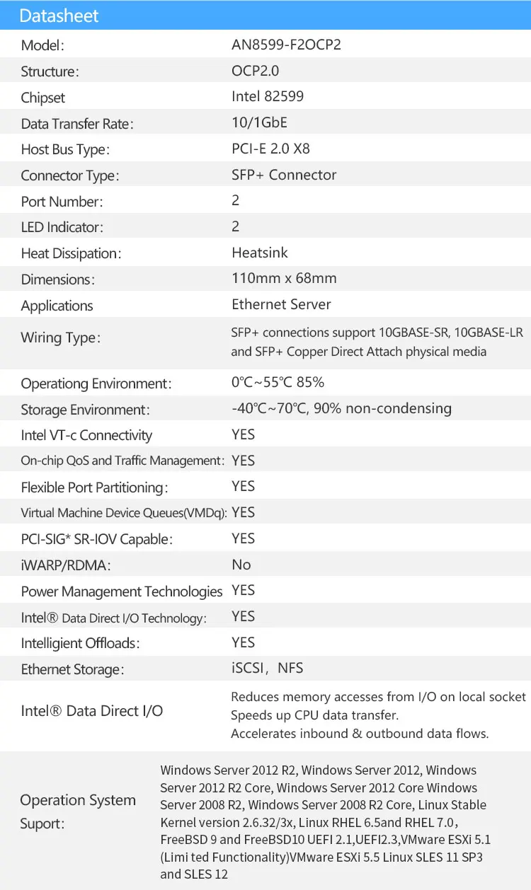 Comprar Tarjeta de red OCP2.0 de 10G, X520-DA2OCP2, Mezzanine, chipset Intel 82599, puerto Dual SFP + PCIe 2,0x8 para servidor de proyectos de ordenador abierto