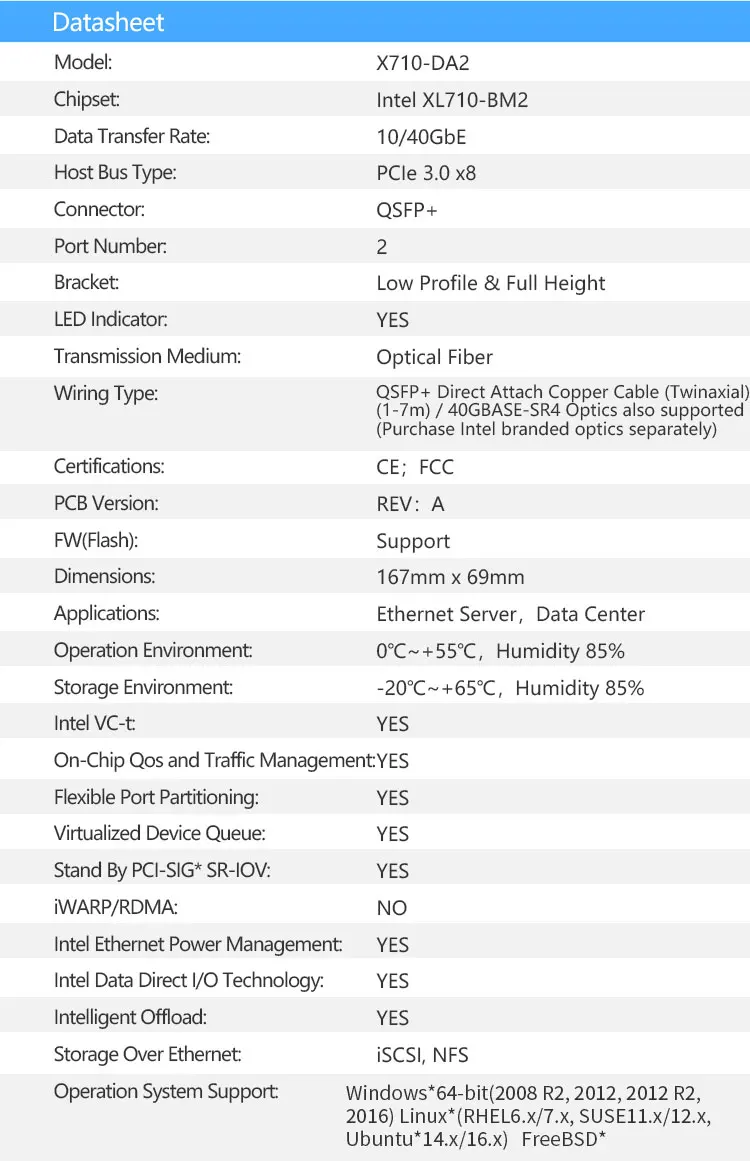 XL710-QDA2 pertenece a los adaptadores de red Ethernet serie 700.Estos adaptadores son la base de la conectividad del servidor, proporcionando una amplia interoperabilidad, optimizaciones de rendimiento crítico y mayor agilidad para soluciones de redes de TI de comunicaciones, Cload e Enterprise.
