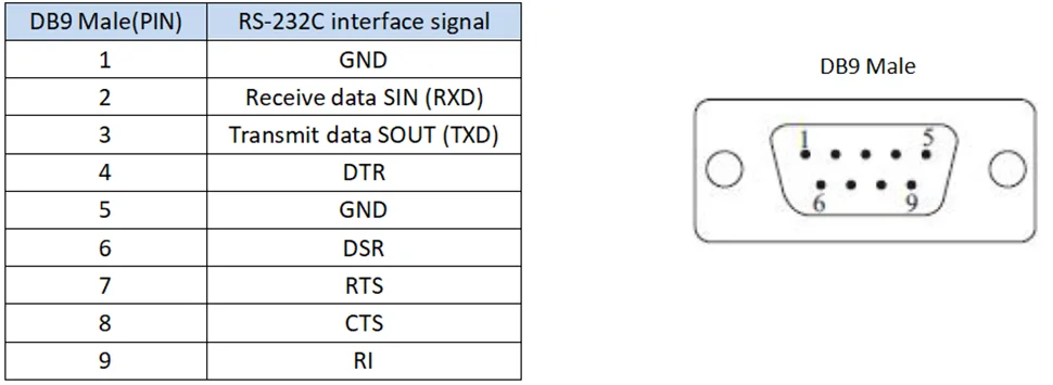 ● Señal: RS-232: DCD, RXD, TXD, DTR, GND, DSR, RTS, CTS, RI