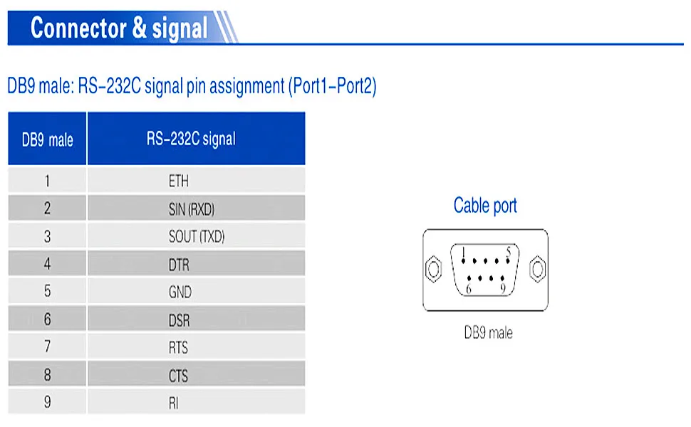 ● Señal: RS-232: DCD, RXD, TXD, DTR, GND, DSR, RTS, CTS, RI