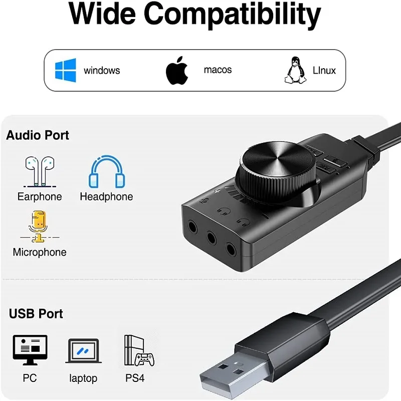 Una tarjeta de sonido útil que se conecta directamente a una computadora portátil o de escritorio sin utilizar un programa de instalación. Mejora considerablemente el sonido, ya que dispone de varios botones de corrección. También tiene un botón de volumen que es útil. En general, es un dispositivo flexible.