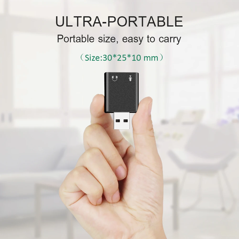 Tarjeta de sonido de Audio USB externa, convertidor de USB a Jack de 3,5mm, adaptador de auriculares, tarjeta de sonido, auriculares, micrófono Virtual de 7.1 canalesDescripción: No diseñado para smartphone Adaptador de audio USB estéreo 3D Especificación USB 2.0 de alta velocidad Compatible con versiones anteriores de USB 1.1 Conectores: USB tipo A, conector de salida estéreo, conector de entrada de micrófono No se requiere alimentación externa Plug & Play, no se necesitan controladores Conectividad USB con auriculares, auriculares, parlantes o micrófono de audio de 3,5 mm. Perfecto para evitar una tarjeta de sonido defectuosa, un puerto de audio o como reemplazo del adaptador de audio USB. Especificaciones: Material: aleación de aluminio Colores: Negro Tamaño: Aprox.42x 30x 12mm Requisitos del sistema: para Windows 8, para Windows 7, para Windows Vista, para Windows XP, para Mac OS 8.6 o superior El paquete incluye: 1 tarjeta de sonido USB