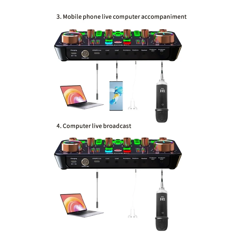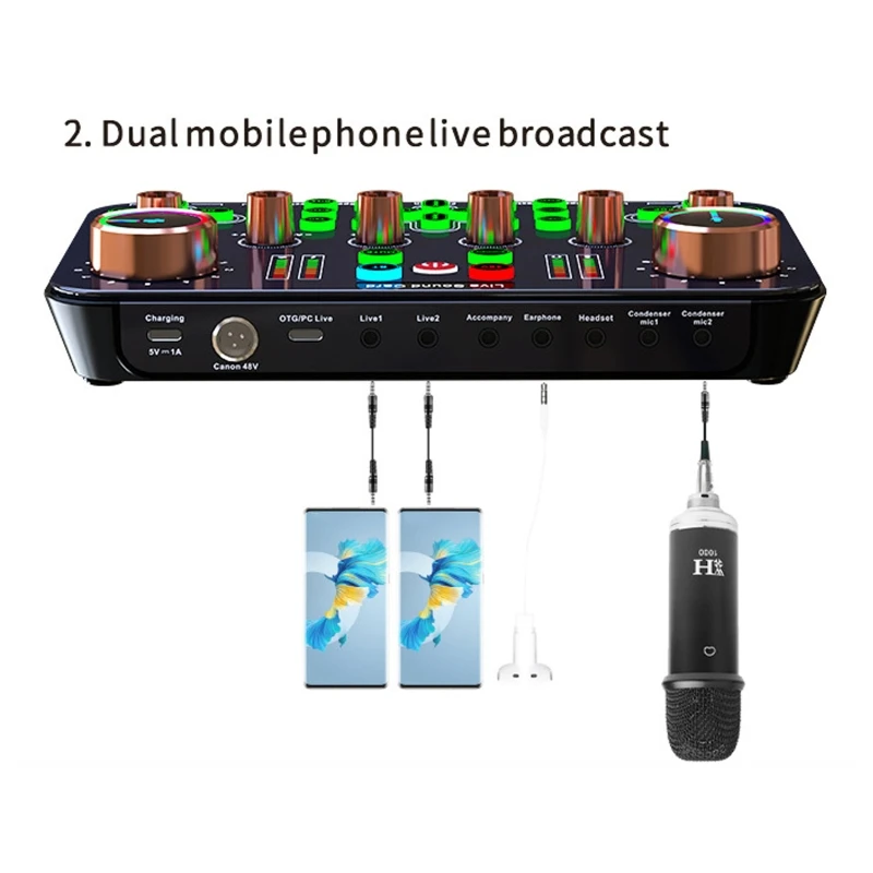 Compatible con 4 personas, micrófonos duales, auriculares duales, mobilepone simultáneo y grabación en vivo por ordenador.