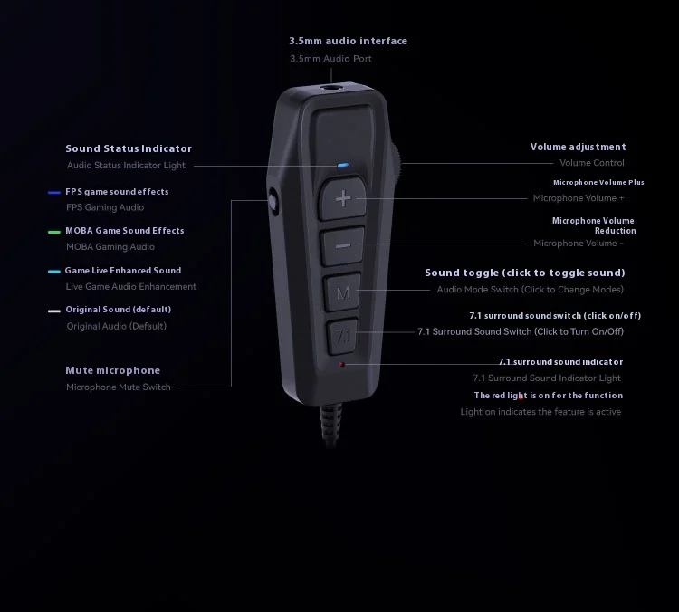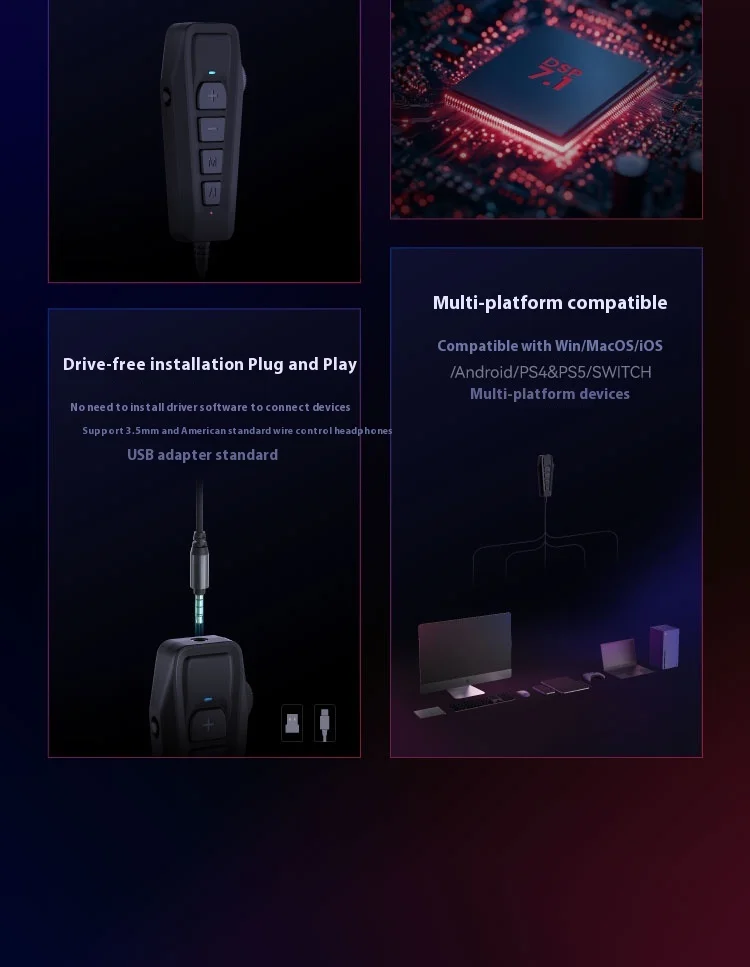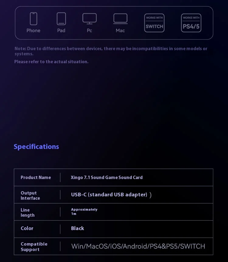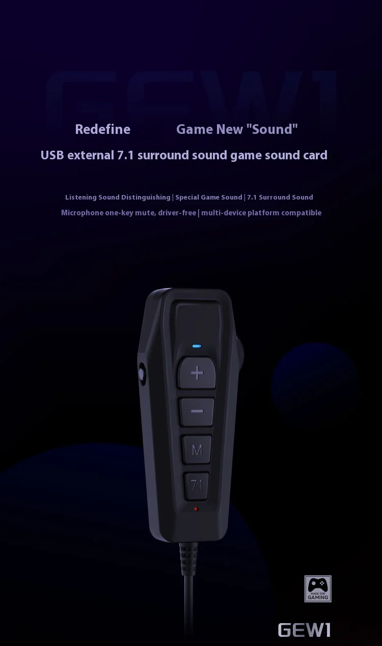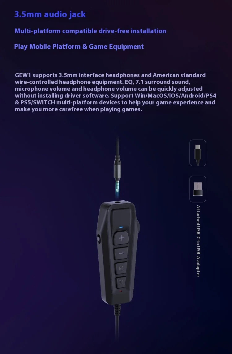 SIMGOT GEW1 tarjeta de sonido de juego externo sonido envolvente HIFI USB a tarjeta de sonido Esports de transmisión en vivo de 3,5 mmNombre del producto: Tarjeta de sonido para juegos de sonido Xingge 7.1 Interfaz de salida: USB-C (adaptador USB estándar) Longitud de la línea: aproximadamente 1 m Color negro Compatibilidad compatible: Win/MacOS/i0S/Android/PS4 y PS5/SWITCH