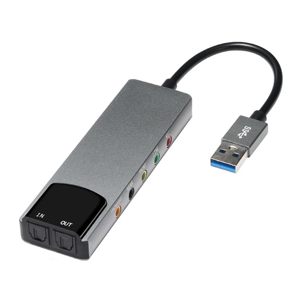 3. Múltiples puertos de entrada y salida:Con tres puertos de entrada (incluyendo una entrada óptica), tres puertos de salida y un puerto de salida óptica, este adaptador de audio USB ofrece amplias opciones de conectividad. Le permite conectar su ordenador a un sistema de altavoces de sonido envolvente 5,1 utilizando conectores estéreo o RCA de 3,5mm, según las especificaciones de su dispositivo de audio.