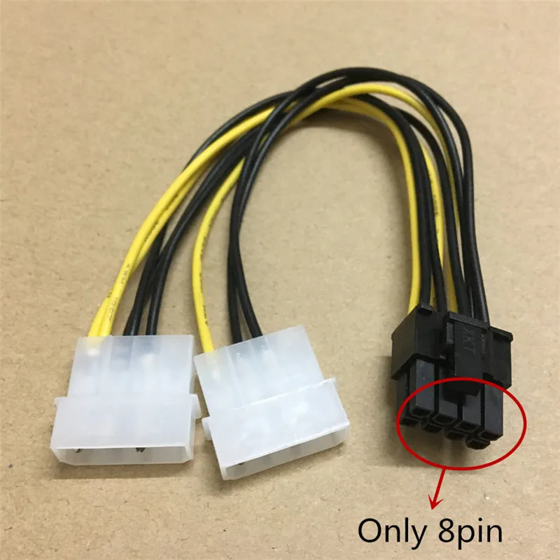 CaracterísticasLas soluciones para conectar su PSU a la tarjeta gráfica PCIe de 6 u 8 pines son las siguientes:Tipo 1-Adaptador Dual Molex a PCIe de 8 pines para la tarjeta vidoe de interfaz PCIe de 8 pines más nueva,Combina dos conectores de fuente de alimentación de PC Molex LP4 de 4 pines en un conector de alimentación auxiliar de tarjeta gráfica PCI Express de 8 pinesDos LP4 con 3 pines macho en el primer lado, conectar a PSUUn conector PCI-E de 8 pines en el segundo lado,Solo para tarjeta gráfica de 8 pines, no cumple con la GPU de 6 pines