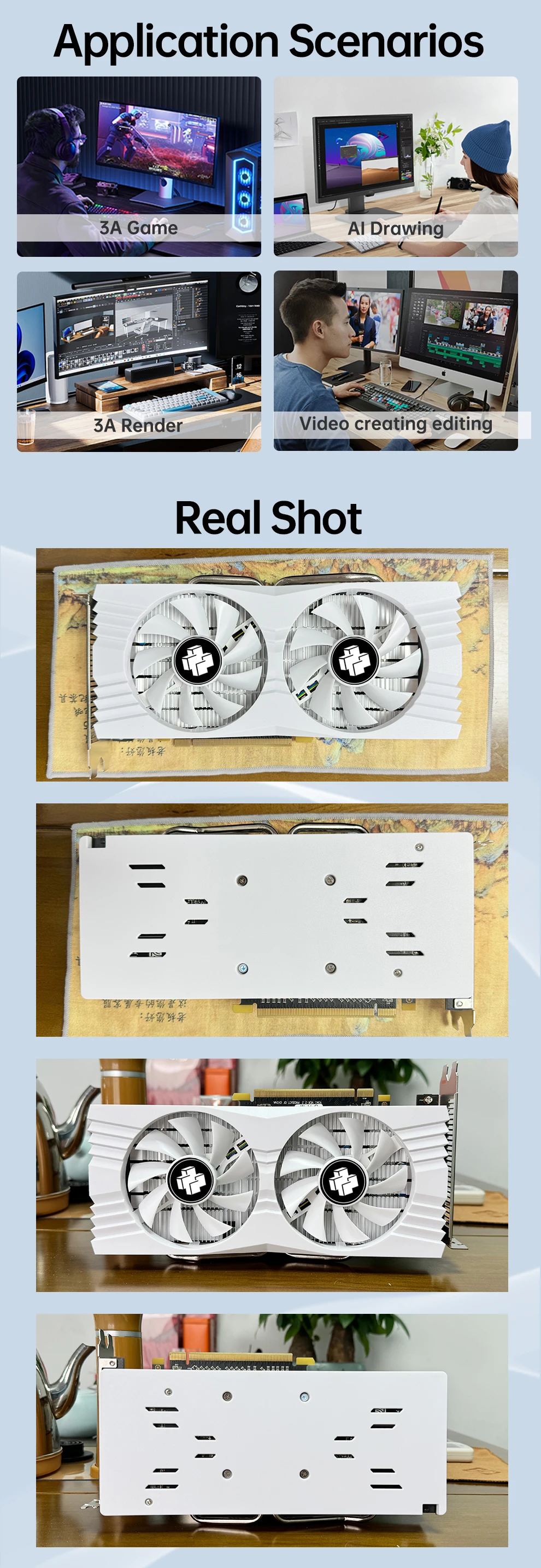 • Enfriador de doble ventilador:El diseño de enfriador de doble ventilador garantiza una disipación de calor óptima, manteniendo la tarjeta gráfica funcionando fresco y sin problemas, incluso durante un uso intensivo.
