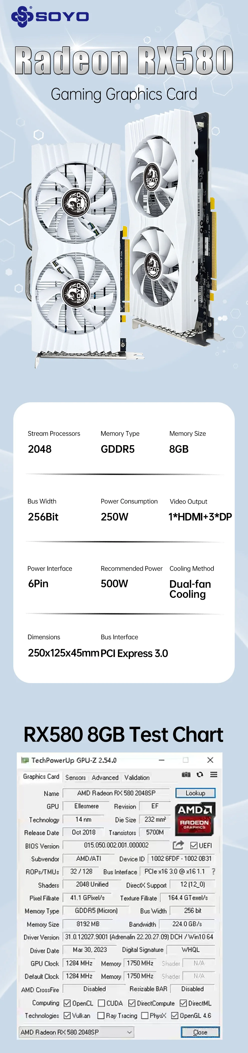 • Pantalla de alta resolución:Las tarjetas gráficas SOYO Radeon RX580 8G cuentan con una resolución máxima de 4096 x 2160, lo que garantiza imágenes nítidas y claras para sus necesidades de juego o reproducción de video.