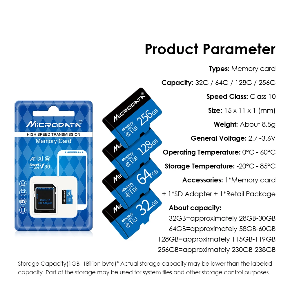 Sobre la capacidad: 8 GB=aproximadamente 7,4 GB-7,6 GB 16 GB=aproximadamente 14,4 GB-14,8 GB 32 GB=aproximadamente 28,5 GB-30 GB 64 GB=aproximadamente 58,5 GB-60 GB 128 GB=aproximadamente 113 GB-125 GB Los proveedores utilizan aritmética decimal de memoria Flash: 1 MB=1000 KB, 1 G=1000 MB Sistema operativo calculado con aritmética binaria: 1 MB=1024 KB, 1 GB=1024 MB; Por lo tanto, existen algunas diferencias entre la capacidad de visualización y la capacidad nominal de los productos de memoria flash. Sobre la velocidad: 8GB/16GB/32GB-Clase 10-SDHC 64 GB/128 GB Clase 10-SDXC La velocidad de la tarjeta Mini SD se basa en pruebas internas; El rendimiento puede ser menor dependiendo del dispositivo host, la interfaz, las condiciones de uso y otros factores. La velocidad de la tarjeta Mini SD se ve muy afectada por el lector de tarjetas, el adaptador, el puerto USB, etc.Un dispositivo de baja calidad reducirá al 100% la velocidad de la tarjeta. Contenido del paquete: 1 tarjeta miniSD 1 adaptador SD. 1 unidad. paquete minorista Por favor tenga en cuenta: 1.Si los productos tienen algún problema, ya que no puede estar satisfecho, comuníquese con el servicio de atención al cliente, le ofreceremos una buena solución. 2.Cuando finalice el tiempo de recepción, pero no has recibido la mercancía.Comuníquese con el servicio de atención al cliente, le proporcionaremos una extensión del tiempo de recepción. 3.Todas las fotos de la mercancía ofrecida, debido a la iluminación, la desviación del color de la pantalla, la diferente comprensión personal de los colores y otros factores, por lo que tal vez haya alguna diferencia de colores entre el producto real y la foto, prevalecerá el color final de los productos reales. Tiempo de entrega: El tiempo estimado de entrega es de 15 a 35 días, si no tiene tiempo suficiente para esperar, no compre. Cuando finalice el tiempo de recepción, pero no has recibido la mercancía. Comuníquese con el servicio de atención al cliente, le proporcionaremos una extensión del tiempo de recepción (países de inspección aduanera estrictos, el tiempo requerido será más largo). Por ejemplo, Brasil 60-90 días)