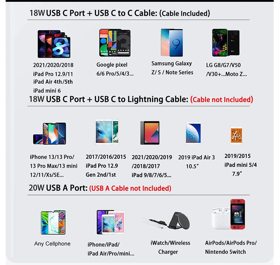 Ampliamente compatibilidad: USB C & USB un cargador rápido para el iPhone 14/14 Plus/14 Pro / 14 Pro Max / 14 / 13 / 13 Pro Max / 13 mini/12/12 Pro Max / 12 mini/SE/11/XS/Xs Max/XR/X/8, samsung Galaxy S22 / S21 / S20 / S10 / S9 / S8, Nota 20 / 10/9/8, a10e/12/32, Google Pixel 6 / 5 / 4a / 4XL / 4 / 3a / 3XL/3/2, teléfonos Android.