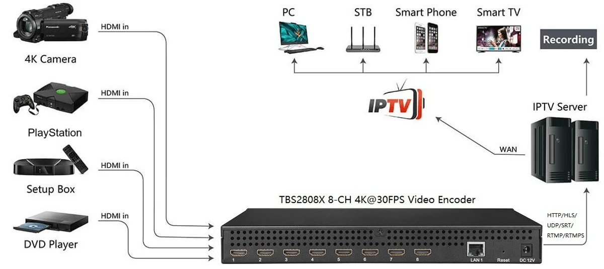 Comprar TBS2808X 8 canales 4K 30Hz H.265/H.264 HDMI Codificador de vídeo compatible con HTTP | HLS(M3U8) | SRT | UDP | Salida RTMP para TV en vivo | Transmisión de eventos