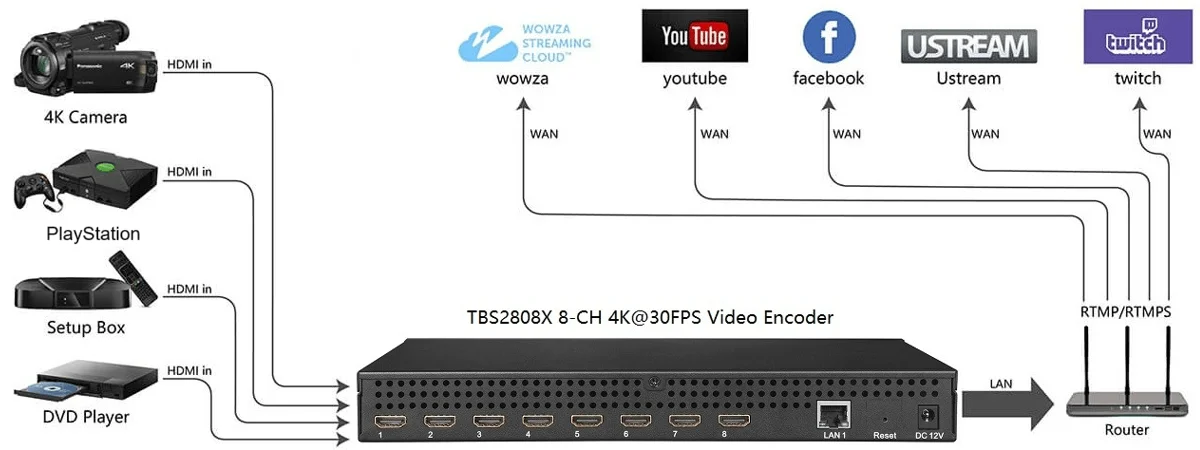 El codificador de vídeo HDMI TBS2808X 8 canales 4K H.265/H.264 puede transmitirse a plataformas populares de redes sociales en línea, incluidas YouTube, Facebook y Twitch, así como servidores RTMP/RTMPS personalizados.Eso esadmite HTTP, HLS (M3U8), SRT (modos de llamada/auditor), multidifusión UDP, salida de protocolo RTMP/RTMPS.