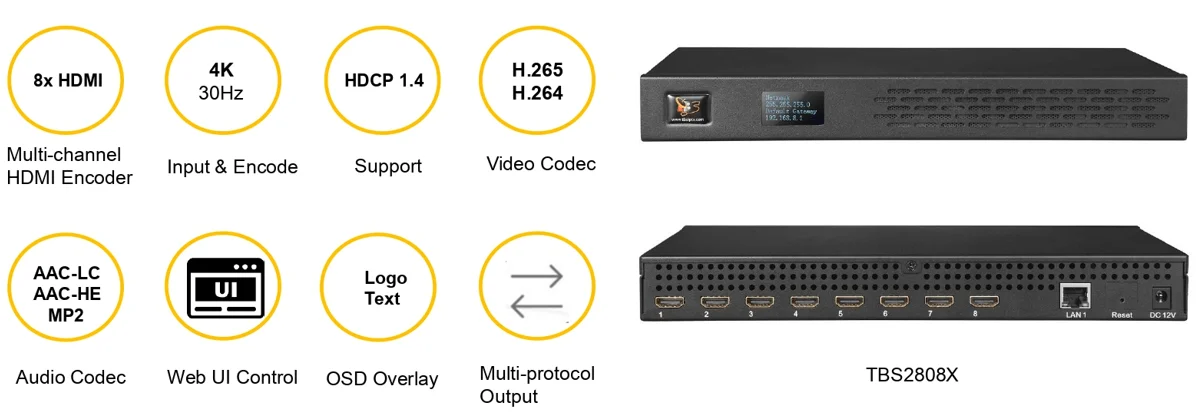 TBS2808Xes unCodificador de vídeo HDMI 4K profesional de 8 canalesque permite la transmisión y visualización de contenido de alta calidad.ApoyaEntrada HDMI de 8 canales 4K@30Hz con codificación 4K@30FPS en tiempo real.