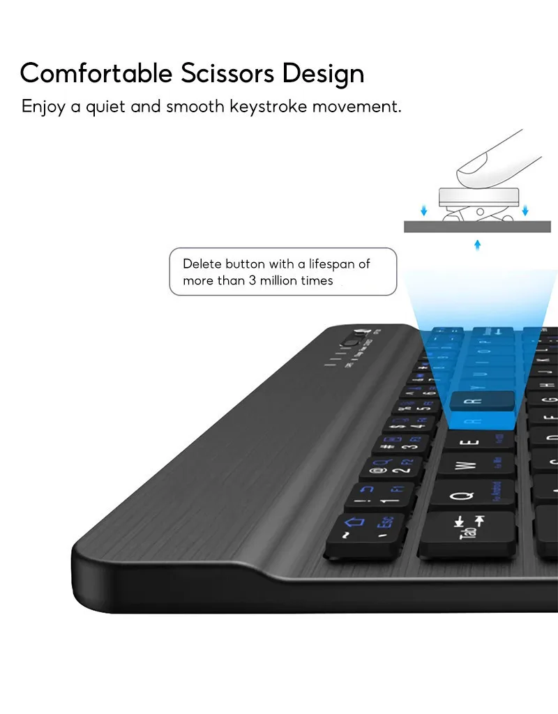 Teclado silencioso de perfil bajo y emparejamiento instantáneo (BT 5.0), compatible con iOS/Android/Windows, mientras que teclas de acceso directo integradas para controles de tabletas (volumen, bloqueo de pantalla, etc.)