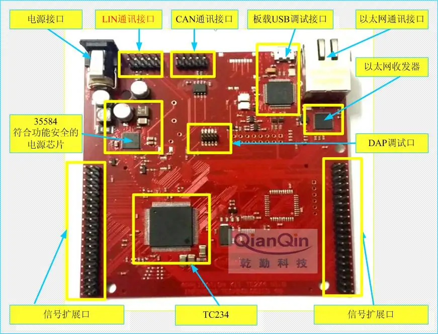 TC234Placa de evaluación predeterminadaMCUModeloSAK-TC234LP-32F200F... A travésTC234Se pueden utilizar recursos ricos en chips y circuitos periféricos en la placa de circuitoTC234La placa tiene función de seguridad (ISO26262) Chip de potencia requeridoTLF35584, Ayuda a acelerar el desarrollo de hardware suave de productos de seguridad funcional... Además, a través de la interfaz de expansión, los usuarios pueden diseñar sus propios circuitos periféricos para verificarTC234Las otras funciones de.TC234La Junta de Evaluación cuenta con los siguientes recursos:
