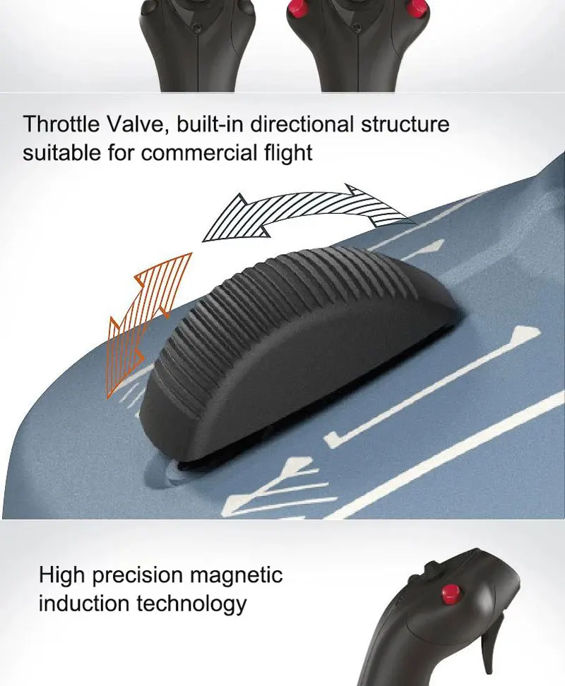 - Vuelo personalizado flexible: barra lateral, 4 módulos de intercambio en caliente con 12 botones y control de válvula de mariposa incorporado.