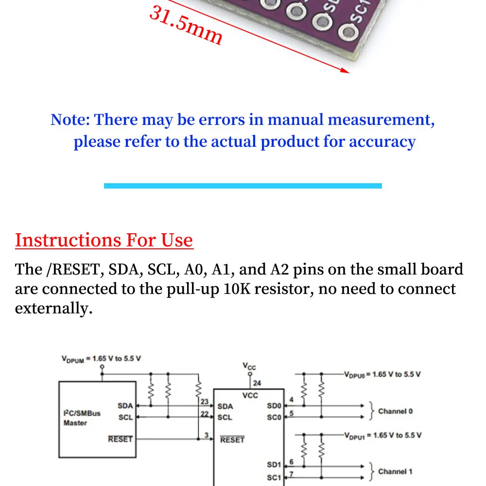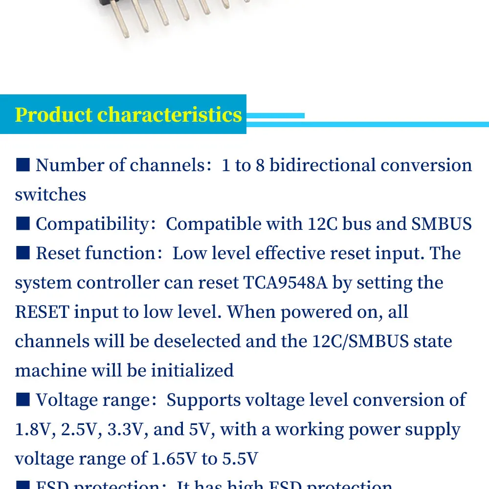 Compatible con bus IIC y bus de administración de sistemas (SMBus), entrada activa de bajo reinicio, soporte para inserción en caliente, baja corriente de espera, sin fallas durante el encendido, soporte para voltajes entre buses de 1,8 V, 2,5 V, 3,3 V y 5 V. Cambio de nivel.