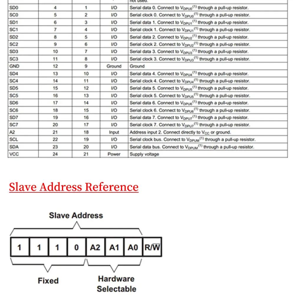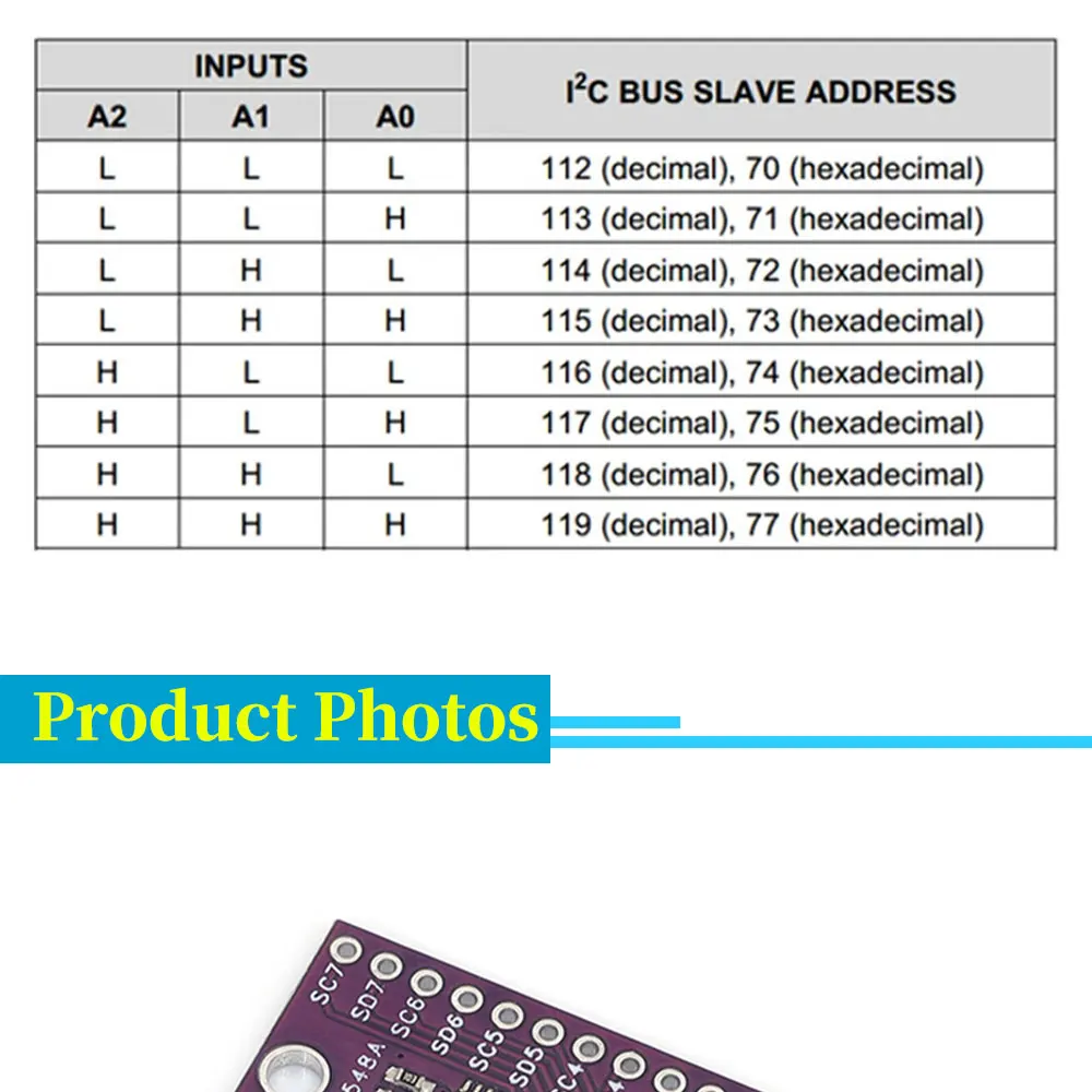 Hay 8 interfaces I2C en un expansor y hay ocho interruptores de transferencia bidireccionales que pueden controlarse mediante el bus I2C.Esto significa que después de transferir 1 expansor, se pueden conectar 8 direcciones idénticas al mismo puerto I2C.El dispositivo también está en uso normal.La dirección predeterminada de este expansor es 0x70, la dirección se puede cambiar y configurar entre 0x70 ~ 0x77 según sus necesidades.En teoría, se pueden conectar en cascada 8 expansores en una dirección de 0x70~0x77, y cada expansor puede conectar 8 dispositivos con la misma dirección.Esto realiza el mismo puerto I2C y conecta 64 dispositivos con la misma dirección y los utiliza normalmente.¡Muy potente!
