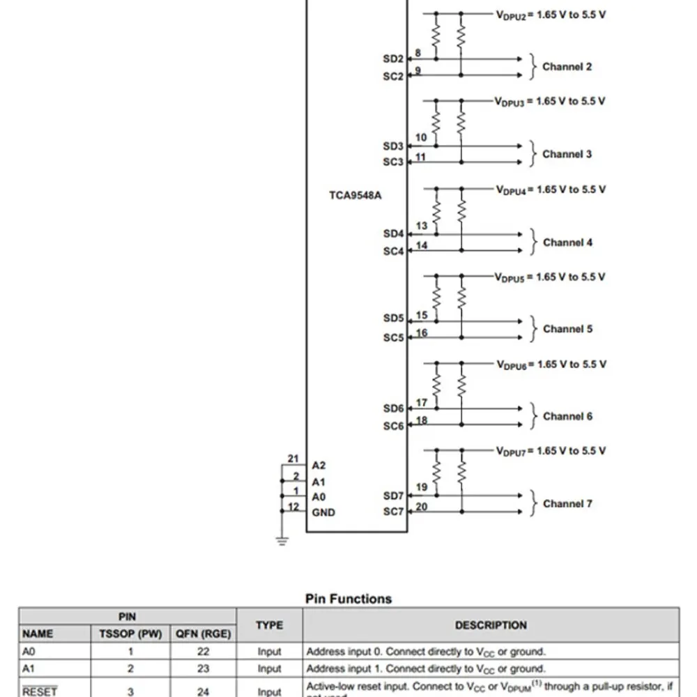 Dependiendo del contenido de los registros de control programables, se puede seleccionar cualquier canal SCn/SDn o combinación de canales.Cuando ocurre un tiempo de espera u otra operación incorrecta, el maestro del sistema puede restablecer el TCA9548A ingresando la entrada /RESET baja.Del mismo modo, un reinicio de encendido deselecciona todos los canales e inicializa la máquina de estado I2C/SMBus.El reinicio e la inicialización también se pueden lograr mediante la inserción/RESET y no es necesario apagar la pieza.El interruptor tiene una puerta de encendido para que el pin VCC pueda usarse para limitar el alto voltaje máximo a través del TCA9548A.Limitar el alto voltaje máximo permite utilizar diferentes voltajes del bus en cada par de canales para que 1.8V, 2.5V o 3.Los componentes de 3 V pueden comunicarse con componentes de 5 V sin ninguna protección adicional; para cada canal, resistencias pull-up externas. El dispositivo eleva el voltaje del bus al nivel de voltaje deseado.Todos los pines de E/S tienen un voltaje soportado de 5 V.