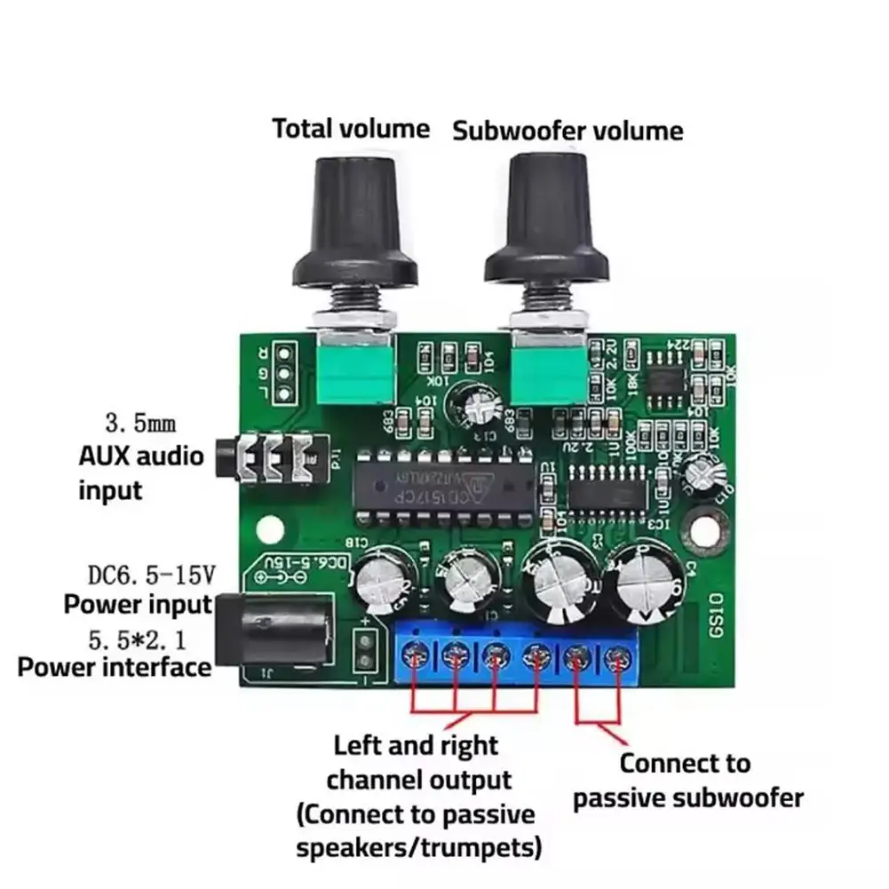 Potencia de salida de graves: máximo 25 W, se recomienda utilizar un subwoofer de 4-6 pulgadas, 4-6 ohmios y 20-50 W.