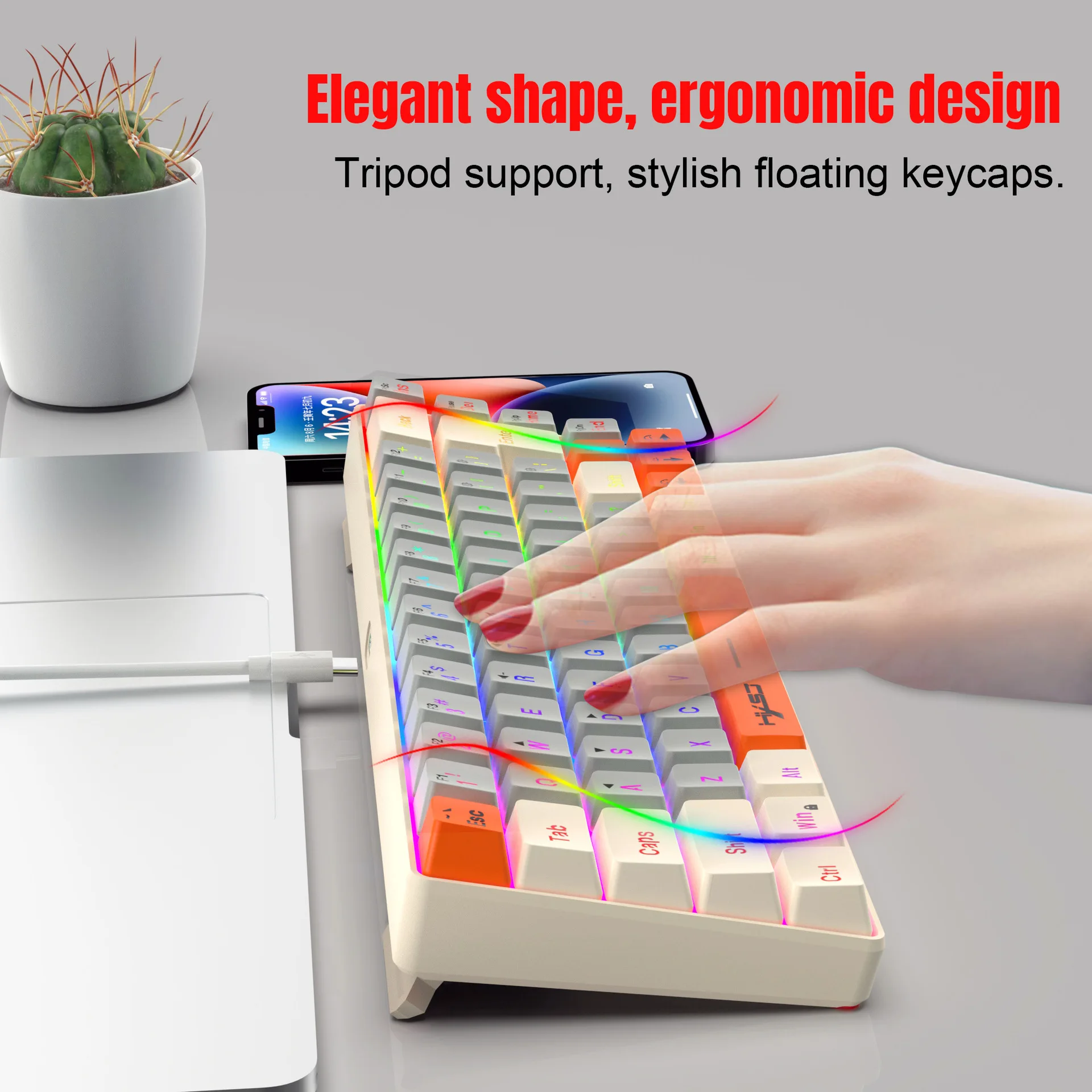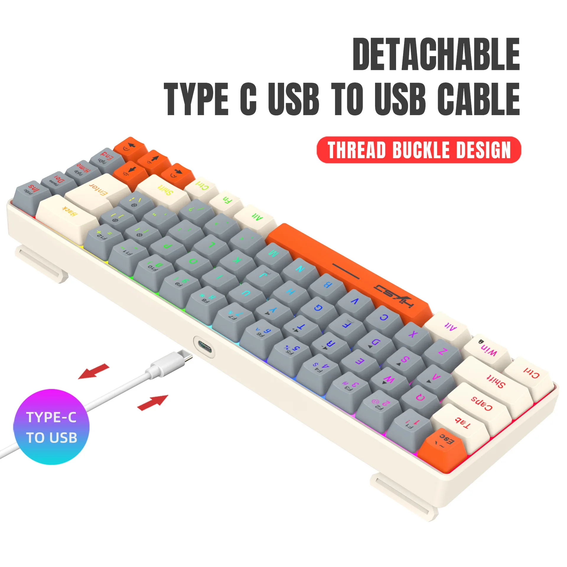 4. Keyboard with detachable key line and USB to Type-C connector, featuring transparent character backlight for easy typing and character recognition.