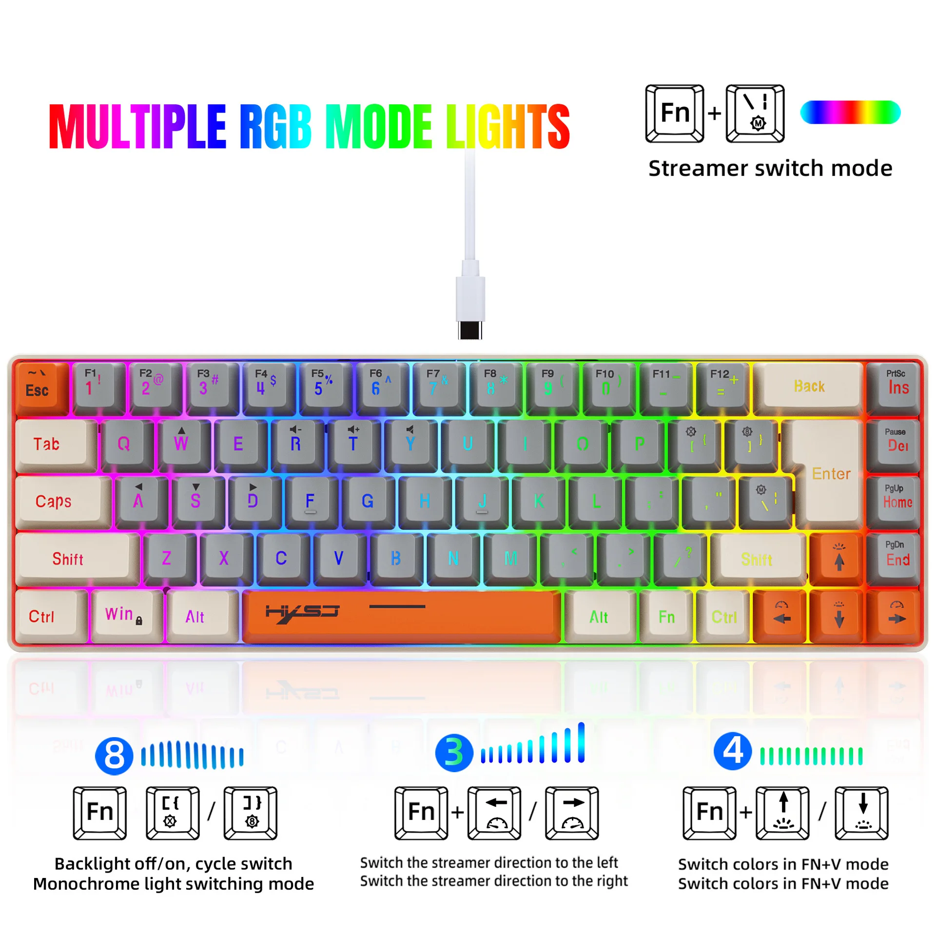 FN + right arrow key streamer speed acceleration, there are 4 speed adjustable speed;The constant light backlight cannot be adjusted;