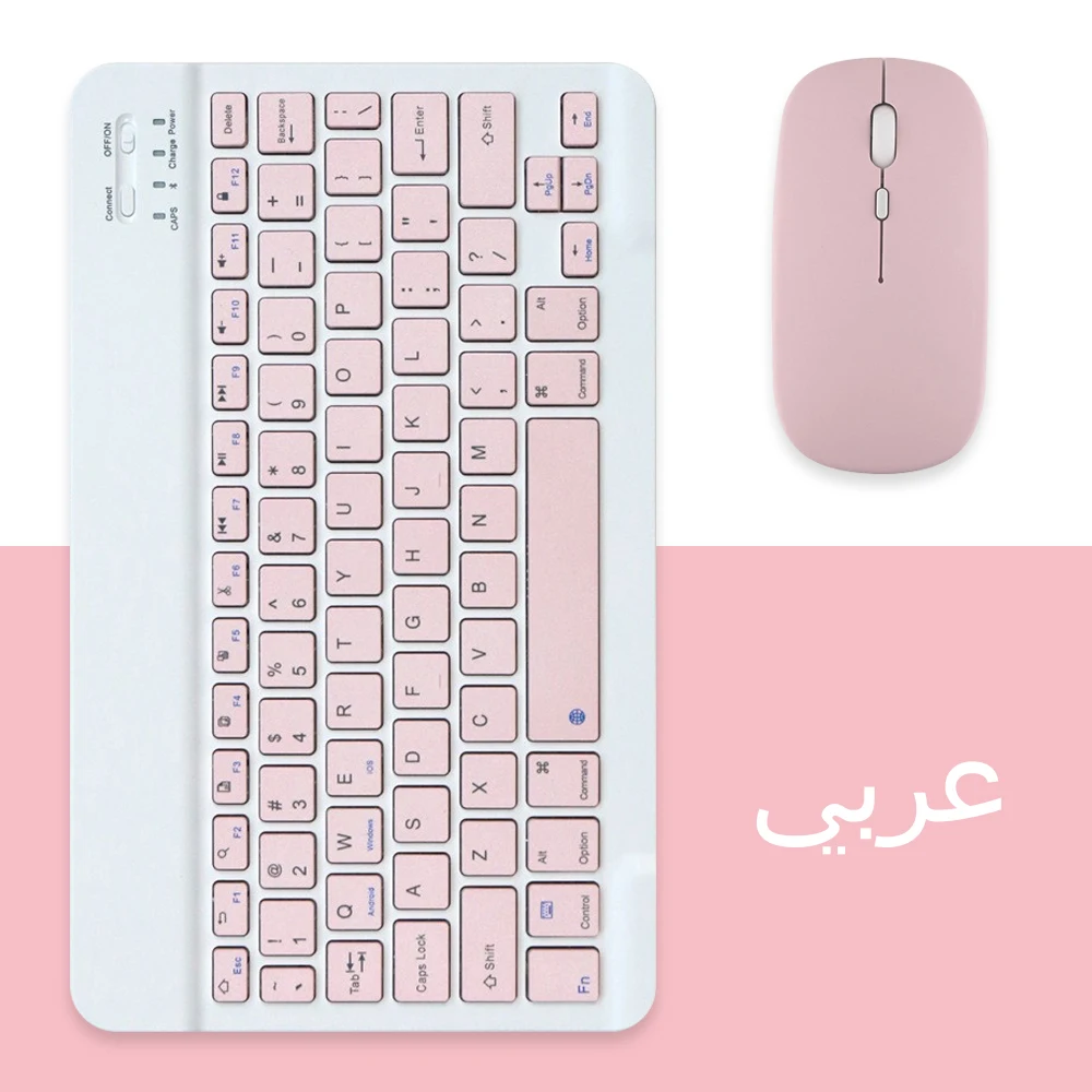 El teclado y el mouse adoptan tecnología avanzada de chip Bluetooth para proporcionar una conexión inalámbrica estable y potente, es fácil de conectar y de usar.El rango de trabajo de hasta 10 m.Este teclado cuenta con control de volumen, teclas de acceso rápido anteriores, posteriores y otros medios.