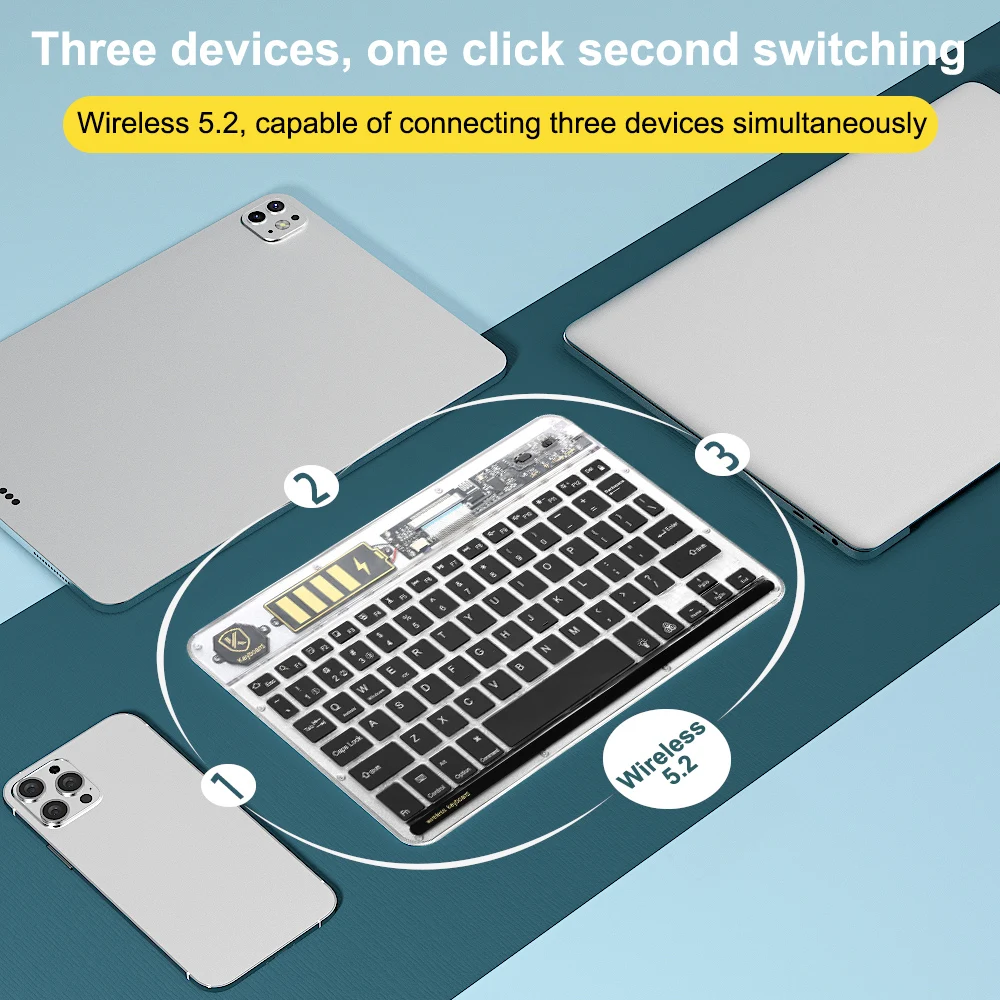 8. Conecte tres dispositivos al mismo tiempo, interruptor de una tecla, la memoria vuelve automáticamente a la conexión, presione Fn + 1/2/3, puede cambiar entre los tres dispositivos conectados.
