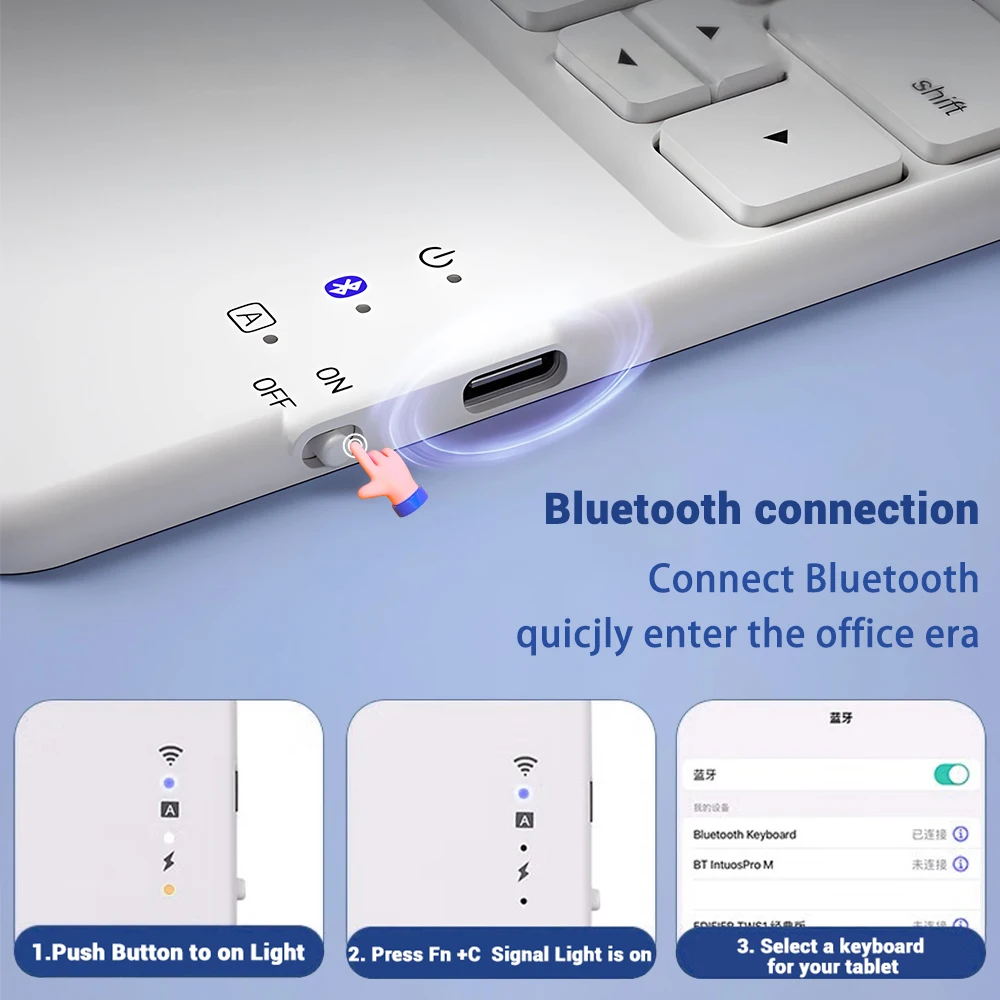 Modo de suspensión inteligente: cuando el teclado no funcione durante 15 minutos, entrará automáticamente en el modo de suspensión. Cuando necesite usarlo, solo necesita tocar el teclado para conectar automáticamente el Bluetooth y comenzar el trabajo normal