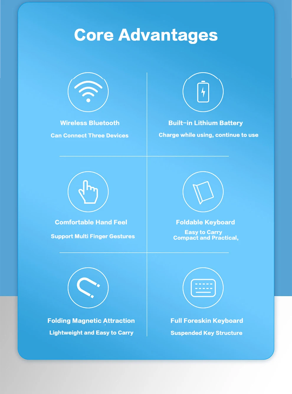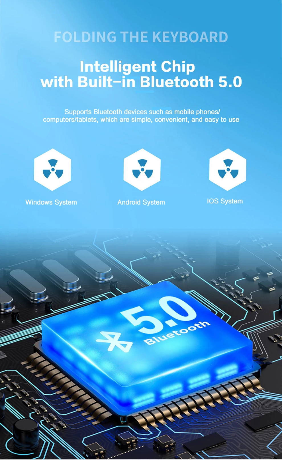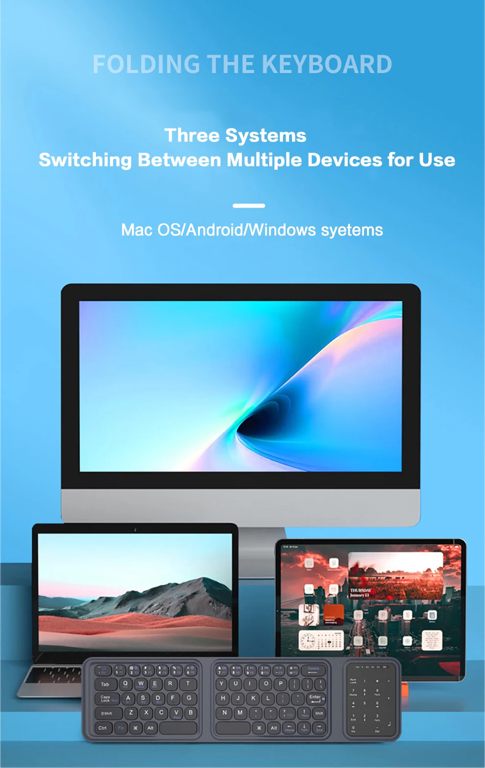 Conectividad multidispositivo BTx3: este teclado plegable admite ambas conexiones inalámbricas Bluetooth, lo que permite cambiar fácilmente entre hasta tres dispositivos.Conéctese a través de Bluetooth: presione Fn+A/S/D, luego Fn+V para emparejar.