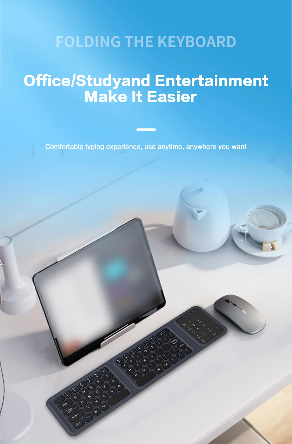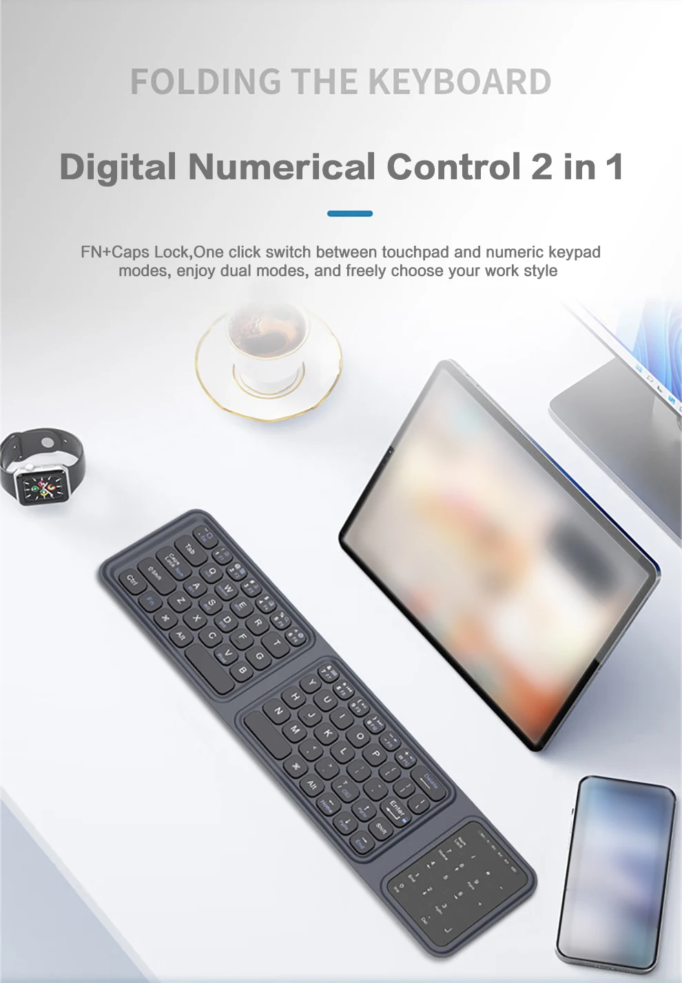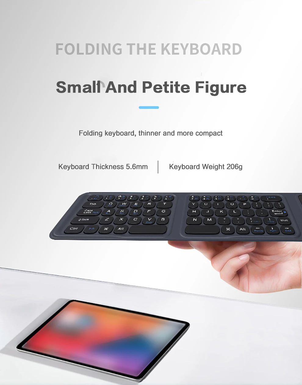 Teclado plegable premium: diseño de 64 teclas con mecanismo de interruptor de tijera y cubierta de cuero PU.Escriba como en un teclado de tamaño completo.Hasta 65 horas de duración de la batería, 100 días en espera.Se conecta a 3 dispositivos a través de Bluetooth.Cambie fácilmente entre el teclado numérico y el panel táctil.No se necesita mouse separado, distancia operativa de Bluetooth de hasta 10 metros (33 pies)