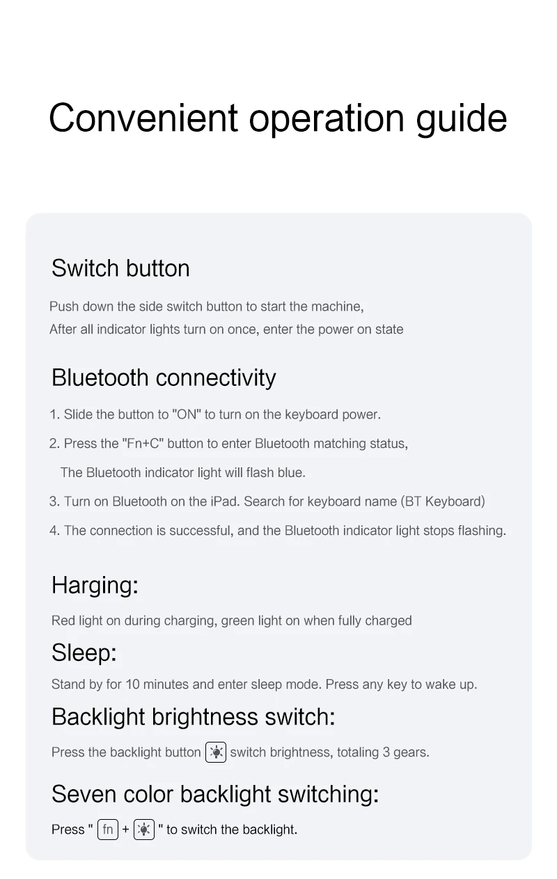 Nota 2:Después de abrir la alimentación, haga clic en "Fn" y "C" 【Fn+C】Botón juntos para abrir el Bluetooth del teclado.Es muy importante.