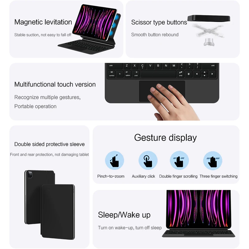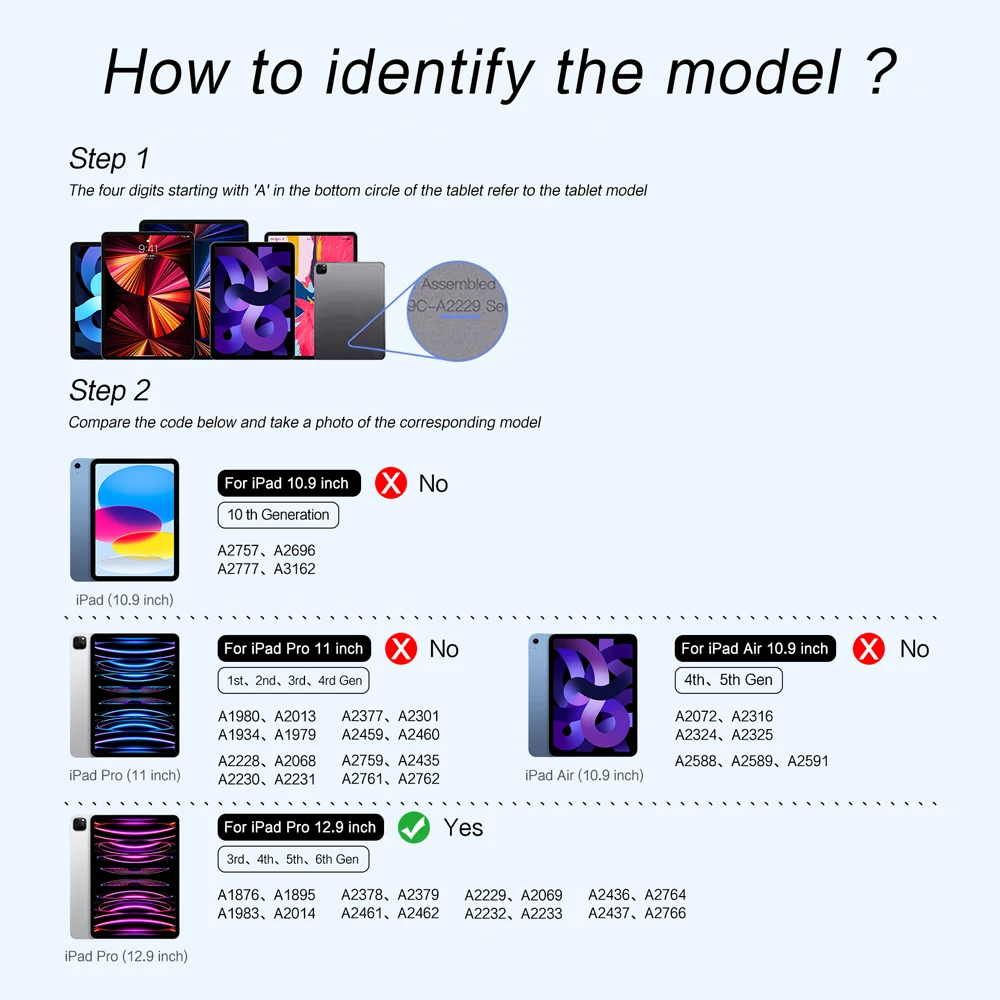 Tenga en cuenta que el Pro 12.9 2018-2022 es compatible con Air de 13 pulgadas, por ejemplo, si compra el modelo Air de 13 pulgadas y recibe un paquete de producto que dice que es adecuado para Pro 12.9 pulgadas 2018-2022, o si compras el Pro 12.9 pulgadas y el paquete del producto dice que es adecuado para Air 13 pulgadas, esto no enviamos el producto incorrecto, sino porque el modelo es compatible.