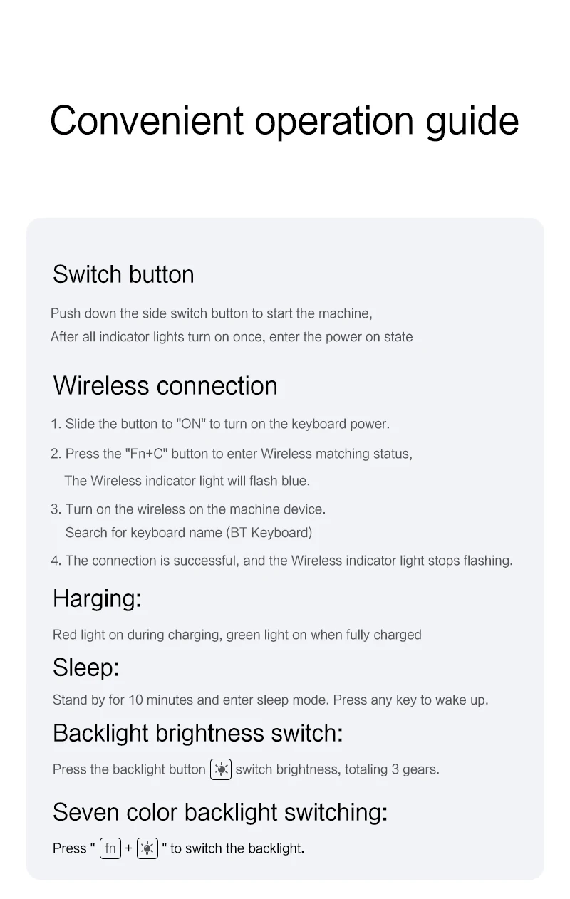 Nota 2:Después de abrir la alimentación, haga clic en "Fn" y "C" 【Fn + C】Botón juntos para abrir el Bluetooth del teclado. Es muy importante.