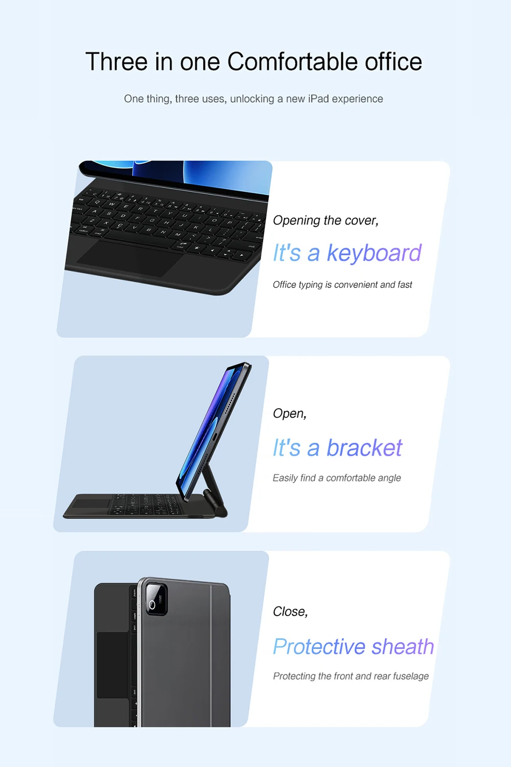Separación magnética, retroiluminación, panel táctil, soporte multiángulo, conexión inalámbrica Bluetooth