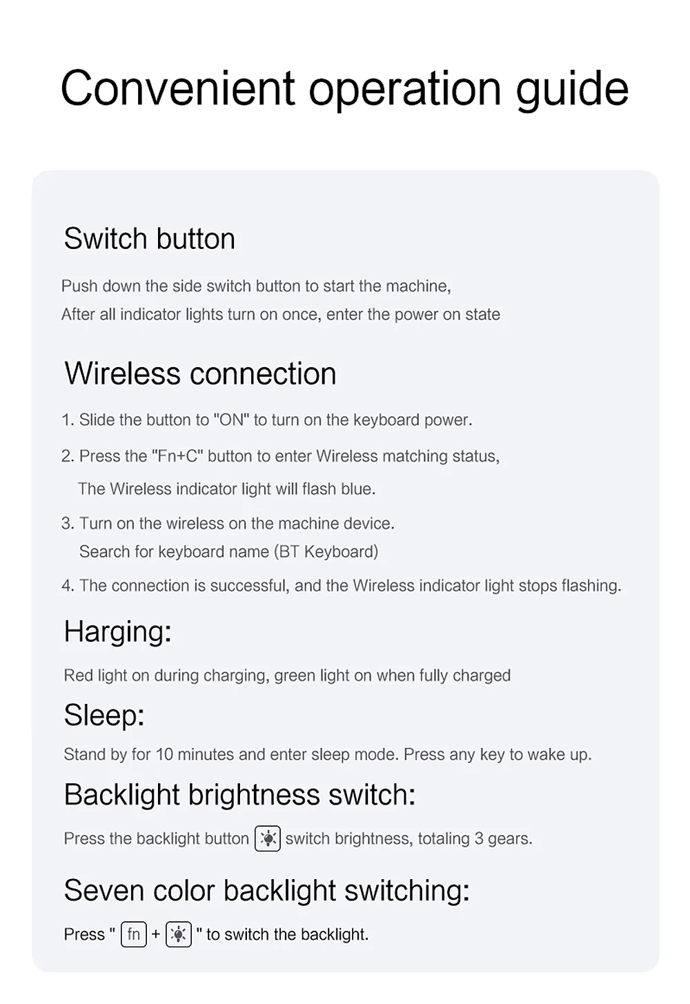 Nota 2:Después de abrir la alimentación, haga clic en "Fn" y "C" 【Fn+C】Botón juntos para abrir el Bluetooth del teclado.Es muy importante.