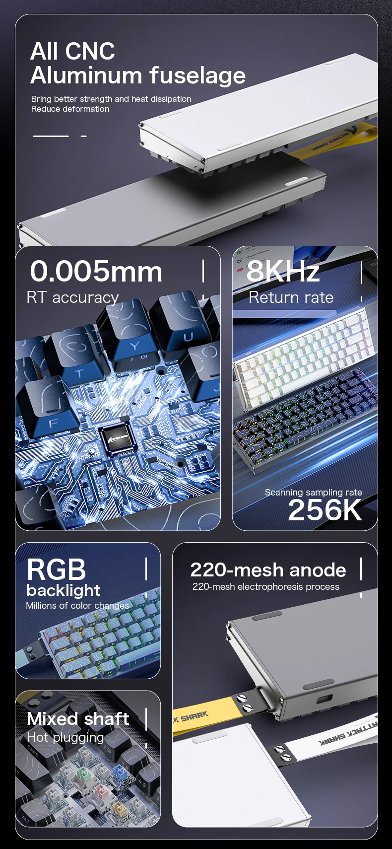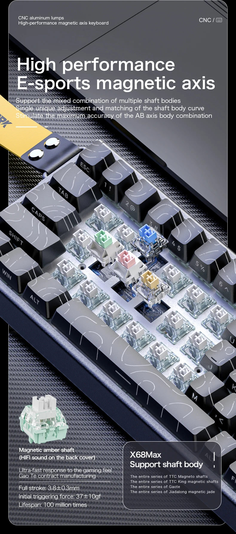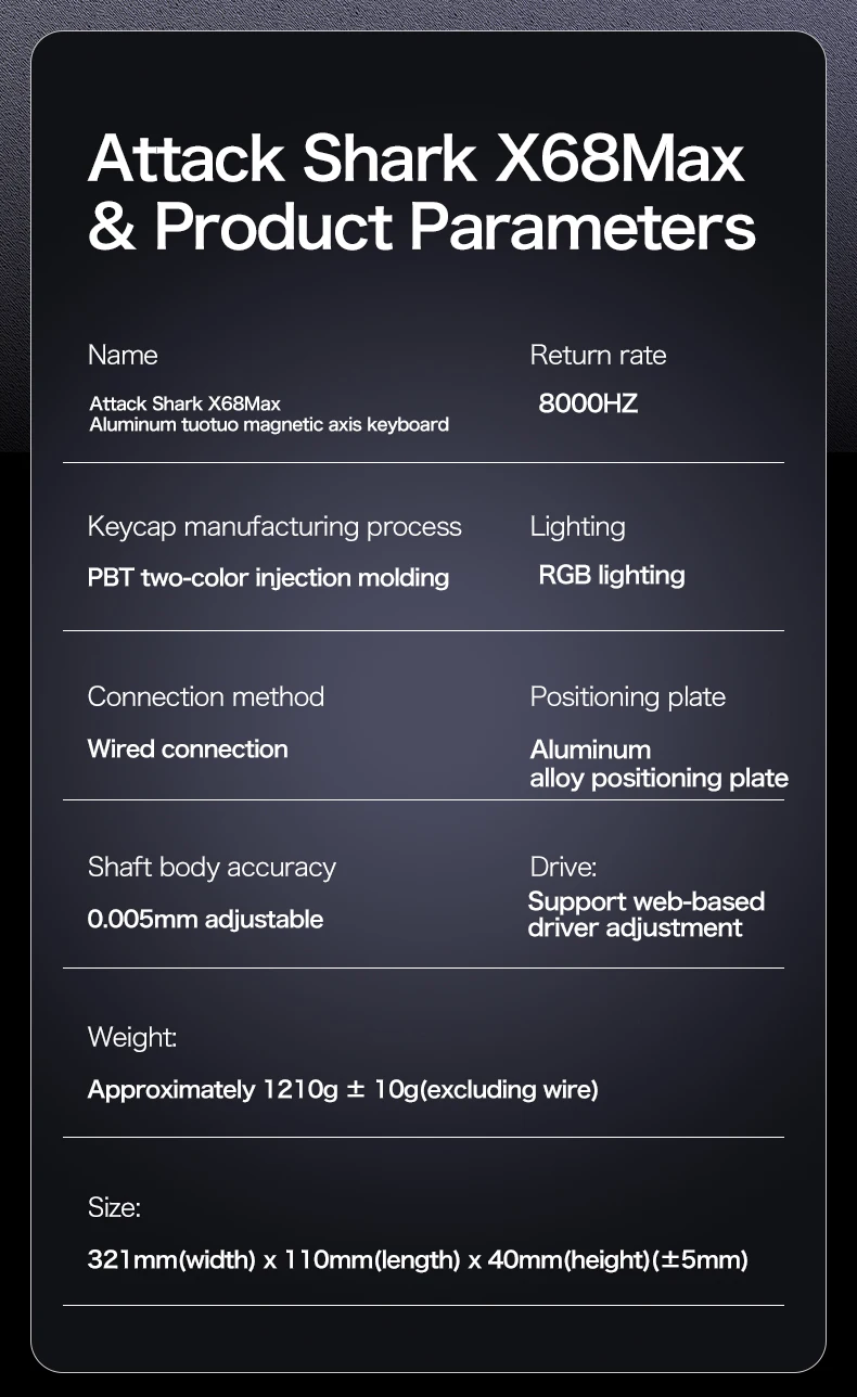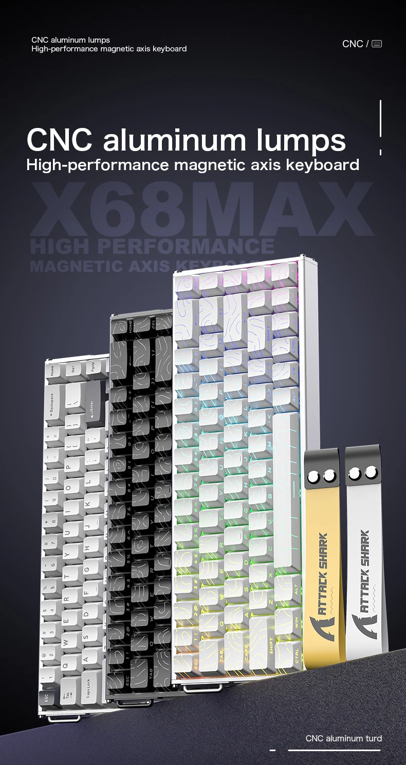 Teclado de eje magnético ATTACK SHARK X68Max| Cuerpo de aluminio CNC| Precisión de 0,005 mm| Velocidad de contaminación de 8000 Hz| Muestreo 256K| Teclas PBT de doble disparo| Controlador web ajustable