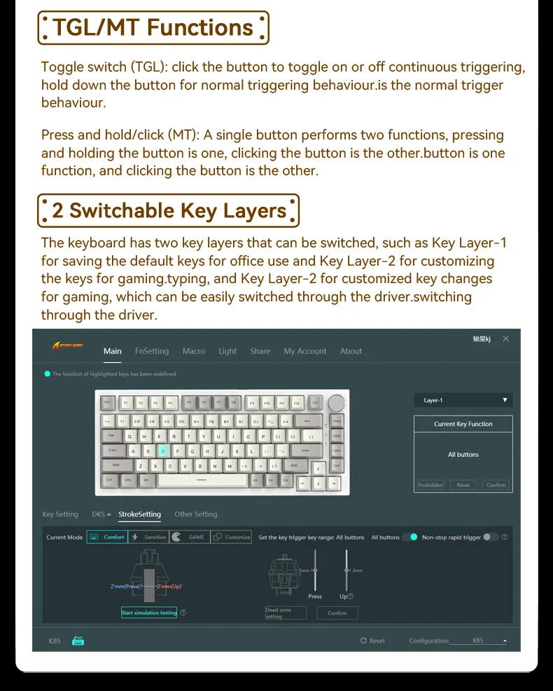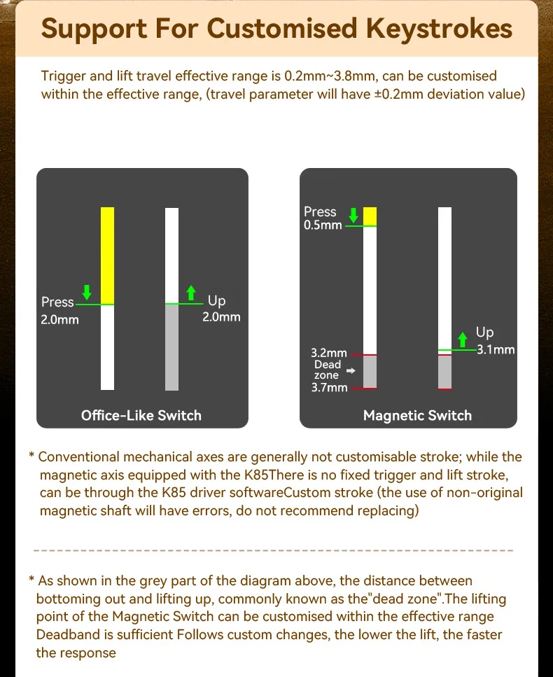 El rango efectivo de la carrera de disparo y elevación es 0.2mm ~ 3.8 mm, se puede personalizar dentro del rango efectivo (los parámetros de recorrido serán ± 0.Valor de desviación de 2 mm) el cuerpo del eje mecánico convencional generalmente no es una carrera personalizable;y K85 equipado con un eje magnético no es un gatillo fijo ni una carrera de elevación, se puede personalizar a través de la carrera del software del controlador K85 (el uso de un eje magnético no genuino habrá un error, no se recomienda reemplazarlo).