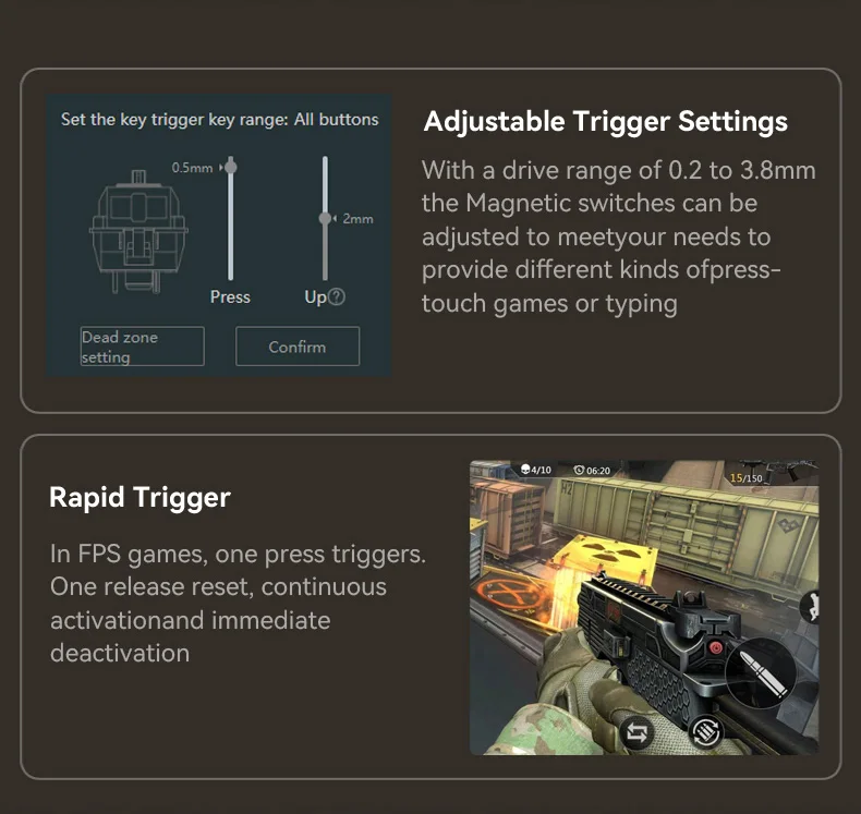 Configuración de gatillo ajustable: con un rango de actuación de 0,2 a 3,8 mm, el interruptor magnético se puede ajustar para satisfacer sus necesidades para proporcionar diferentes tipos de toque de presión para jugar o escribir.