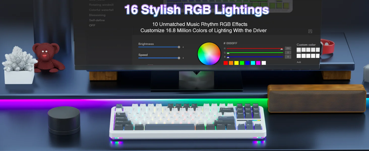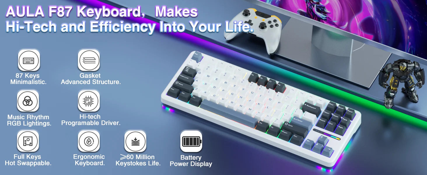 AULA F87 Pro tiene múltiples modos retroiluminados RGB que puede cambiar con atajos simples, puede elegir entre iluminación RGB dinámica con 16,8 millones de colores o una elegante retroiluminación monocromática, efectos RGB de bricolaje con el software personalizado AULA.El F87 Pro también cuenta con tiras de luces laterales y efectos rítmicos musicales, todos personalizables para una experiencia personalizada y visualmente impresionante.Con el software, se pueden configurar todo tipo de funciones de teclas del teclado, grabar macro, guardar múltiples configuraciones macro, etc.