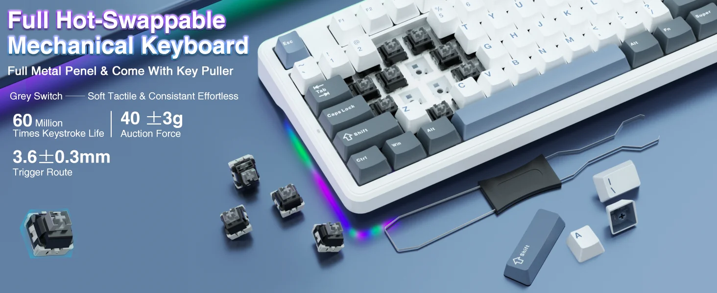 Disponible con los interruptores personalizados LEOBOG Greywood V3 y LEOBOG Nimbus V3 Full-POM, el F87 Pro ofrece una excelente respuesta táctil y durabilidad.Además, con los enchufes de teclas completas intercambiables en caliente, puedes adaptar tu experiencia de escritura a tus preferencias exactas.
