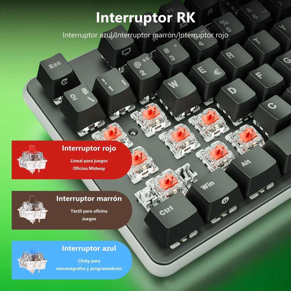 Interruptor azul: el interruptor azul puede ofrecer una respuesta más rápida y elástica, un sonido de clic nítido para disfrutar de la escritura primaveral y una respuesta táctil precisa para un máximo rendimiento de juego.