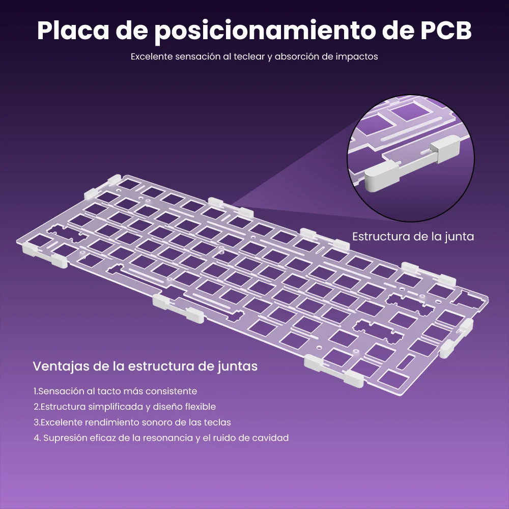 Utiliza un diseño de montaje en junta con una estructura insonorizada de 5 capas, que proporciona una sensación de escritura constante, un excelente rendimiento acústico y suprime eficazmente la resonancia de la caja y el sonido de la cavidad.